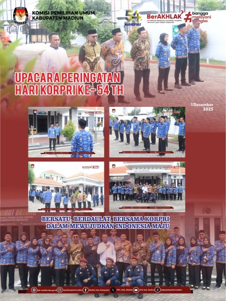 Madiun – (1/12/2025) Komisi Pemilihan Umum (KPU) Kabupaten Madiun menggelar upacara dalam rangka memperingati Hari Ulang Tahun ke-54 Korps Pegawai Republik Indonesia (KORPRI) di halaman kantornya. Bertindak sebagai pembina upacara, Sekretaris KPU Kabupaten Madiun, Agung D. M., memimpin secara khidmat seluruh komisioner, kepala subbagian, serta staf sekretariat. Dalam amanatnya, Agung menyerukan pentingnya memperkuat nilai persatuan dan integritas, selaras dengan tema nasional tahun ini: “Bersatu, Berdaulat, Bersama KORPRI Mewujudkan Indonesia Maju”. Ia mengajak seluruh Aparatur Sipil Negara (ASN) di lingkungan KPU Kabupaten Madiun untuk senantiasa menjaga semangat pengabdian yang tinggi dalam menjalankan setiap amanah kelembagaan. Lebih lanjut, Agung menekankan kedisiplinan sebagai fondasi utama, termasuk ketertiban dalam mengenakan atribut lengkap KORPRI seperti pin, name tag, dan kartu identitas. Ia juga mendorong seluruh jajaran untuk terus meningkatkan kompetensi dan profesionalisme, memperkuat kualitas pelayanan publik, serta meneguhkan integritas guna menjawab tantangan tata kelola pemerintahan yang semakin dinamis dan modern. Sebagai penutup rangkaian acara, upacara ditutup dengan doa bersama dan sesi foto seluruh peserta. Momen ini menjadi simbol kebersamaan sekaligus wujud komitmen kolektif untuk menjadikan nilai-nilai KORPRI sebagai pilar utama dalam pengabdian ASN yang unggul dan berintegritas. Penulis: Risma Editor: Endy S. ....