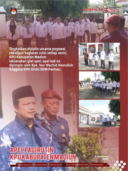 Madiun — Komisi Pemilihan Umum (KPU) Kabupaten Madiun melaksanakan Apel Rutin pada Senin, 8 Desember 2025, di halaman kantor KPU Kabupaten Madiun. Kegiatan ini dipimpin oleh Nur Wachid Nasrulloh, selaku Anggota KPU Kabupaten Madiun Divisi Sumber Daya Manusia dan Partisipasi Masyarakat (SDM dan Parmas). Apel diikuti oleh Ketua dan Anggota KPU Kabupaten Madiun, Sekretaris, para Kepala Subbagian, serta seluruh staf kesekretariatan. Dalam amanatnya, Nur Wachid Nasrulloh mengingatkan tugas-tugas yang harus diselesaikan di penghujung akhir tahun 2025 dan terus mengoptimalkan kinerja di setiap divisi. Beliau mengingatkan agar Divisi SDM dan Parmas terus meningkatkan kualitas publikasi melalui penguatan konten media sosial serta pengembangan podcast edukatif. Demikian pula untuk Divisi Perencanaan, Data, dan Informasi (Rendatin) agar meningkatkan ketelitian dan ketepatan dalam penyusunan laporan Pemutakhiran Data Pemilih Berkelanjutan (PDPB). Selain itu, Divisi Teknis agar memastikan proses penyusunan database hasil Pemilu dan Pilkada bisa segera selesai. Sementara itu, Divisi Hukum diharapkan dapat memulai penyusunan laporan Zona Integritas guna mendorong terwujudnya tata kelola kelembagaan yang transparan dan berintegritas. “Optimalisasi kinerja tiap divisi ini bertujuan untuk memperkuat koordinasi, meningkatkan efisiensi, serta memastikan setiap tugas berjalan akurat dan transparan demi pelayanan kepemiluan yang profesional dan terpercaya,” tuturnya. Kegiatan apel ditutup dengan doa bersama sebagai bentuk ikhtiar dan harapan agar seluruh tugas dan tanggung jawab ke depan dapat berjalan lancar dan penuh keberkahan. Penulis: Risma Editor: Endy S. ....