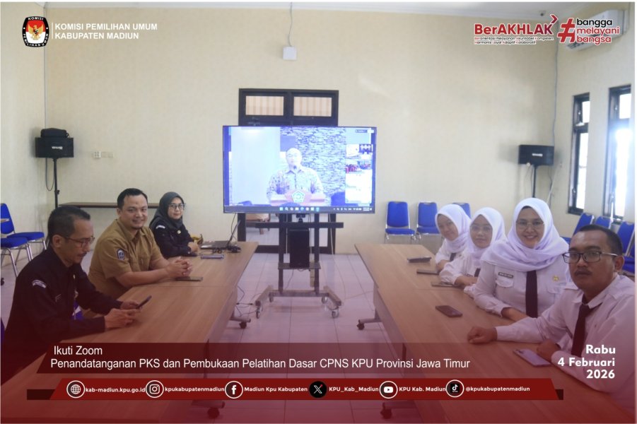 Madiun — KPU Kabupaten Madiun turut mengikuti kegiatan Penandatanganan Perjanjian Kerja Sama (PKS) serta Pembukaan Pelatihan Dasar (Latsar) Calon Pegawai Negeri Sipil (CPNS) KPU Provinsi Jawa Timur Tahun 2026, yang dilaksanakan pada Rabu (4/2/2026) pukul 11.00 WIB hingga selesai. Kegiatan tersebut merupakan agenda resmi KPU Provinsi Jawa Timur sebagai langkah awal pelaksanaan Latsar CPNS Tahun 2026. Dalam kesempatan tersebut, dilakukan penandatanganan Perjanjian Kerja Sama antara KPU Provinsi Jawa Timur dengan Kementerian Agama Provinsi Jawa Timur sebagai wujud sinergi antarinstansi dalam mendukung kelancaran dan keberhasilan pelaksanaan pelatihan dasar CPNS di lingkungan KPU Jawa Timur. Keikutsertaan KPU Kabupaten Madiun dalam kegiatan ini menjadi bagian dari komitmen untuk mendukung pelaksanaan Latsar CPNS secara optimal, sekaligus memastikan seluruh peserta CPNS memperoleh pembinaan yang terarah dan sesuai dengan ketentuan yang berlaku. Melalui kerja sama tersebut, diharapkan pelaksanaan Latsar CPNS KPU Provinsi Jawa Timur Tahun 2026 dapat berjalan lebih terstruktur dan efektif, serta mampu membentuk aparatur sipil negara (ASN) yang profesional, berintegritas, dan siap menjalankan tugas di lingkungan KPU. Penulis: Anissa Editor: Endy S. ....
