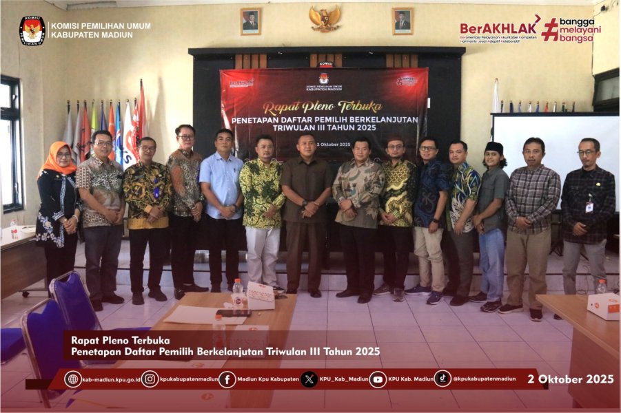 Madiun — Komisi Pemilihan Umum (KPU) Kabupaten Madiun melaksanakan Rapat Pleno Terbuka Pemutakhiran Data Pemilih Berkelanjutan (PDPB) Triwulan III Tahun 2025, Kamis (2/10/2025), di aula kantor KPU Kabupaten Madiun. Rapat pleno dipimpin langsung oleh Ketua KPU Kabupaten Madiun, Nur Anwar, dan dihadiri oleh jajaran komisioner, Sekretaris dan Kasubbag Sekretariat KPU Kabupaten Madiun. Kegiatan ini juga turut disaksikan oleh perwakilan Bawaslu Kabupaten Madiun, Polres Madiun, Kodim 0803, Badan Kesbangpol Kabupaten Madiun, Dinas Kependudukan dan Pencatatan Sipil (Dispendukcapil) Kabupaten Madiun, serta Dinas Pemberdayaan Masyarakat dan Desa (DPMD) Kabupaten Madiun.     Dalam sambutannya, Nur Anwar menegaskan bahwa pemutakhiran data pemilih berkelanjutan merupakan agenda penting KPU untuk menjamin hak pilih masyarakat. “Melalui pleno terbuka ini, kami ingin memastikan bahwa daftar pemilih di Kabupaten Madiun selalu mutakhir, akurat, dan dapat dipertanggungjawabkan. Kehadiran stakeholder hari ini adalah bentuk keterbukaan dan transparansi KPU,” ujarnya. Agenda pleno terbuka meliputi penyampaian rekapitulasi hasil pemutakhiran data pemilih hingga akhir Triwulan III, yang mencakup penambahan pemilih baru, pemilih yang tidak memenuhi syarat, serta perbaikan elemen data pemilih. Selain itu, pleno juga menjadi forum untuk menyampaikan masukan dan rekomendasi dari para pihak terkait guna meningkatkan kualitas daftar pemilih ke depan.     Kehadiran Bawaslu, aparat keamanan, serta instansi pemerintah daerah dalam rapat pleno ini menegaskan komitmen bersama dalam mendukung terwujudnya data pemilih yang valid, transparan, dan inklusif.     Penulis: Endy S.