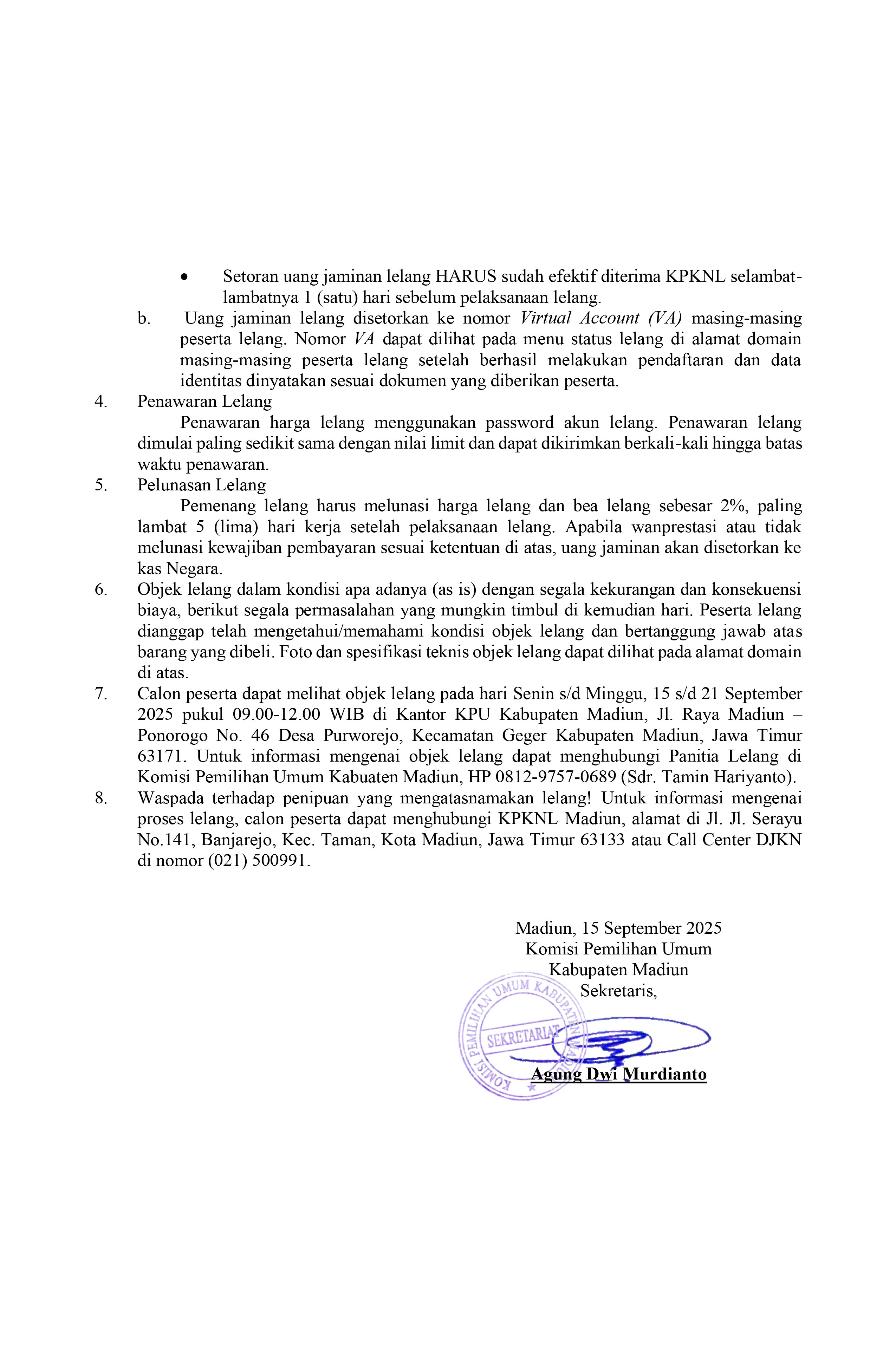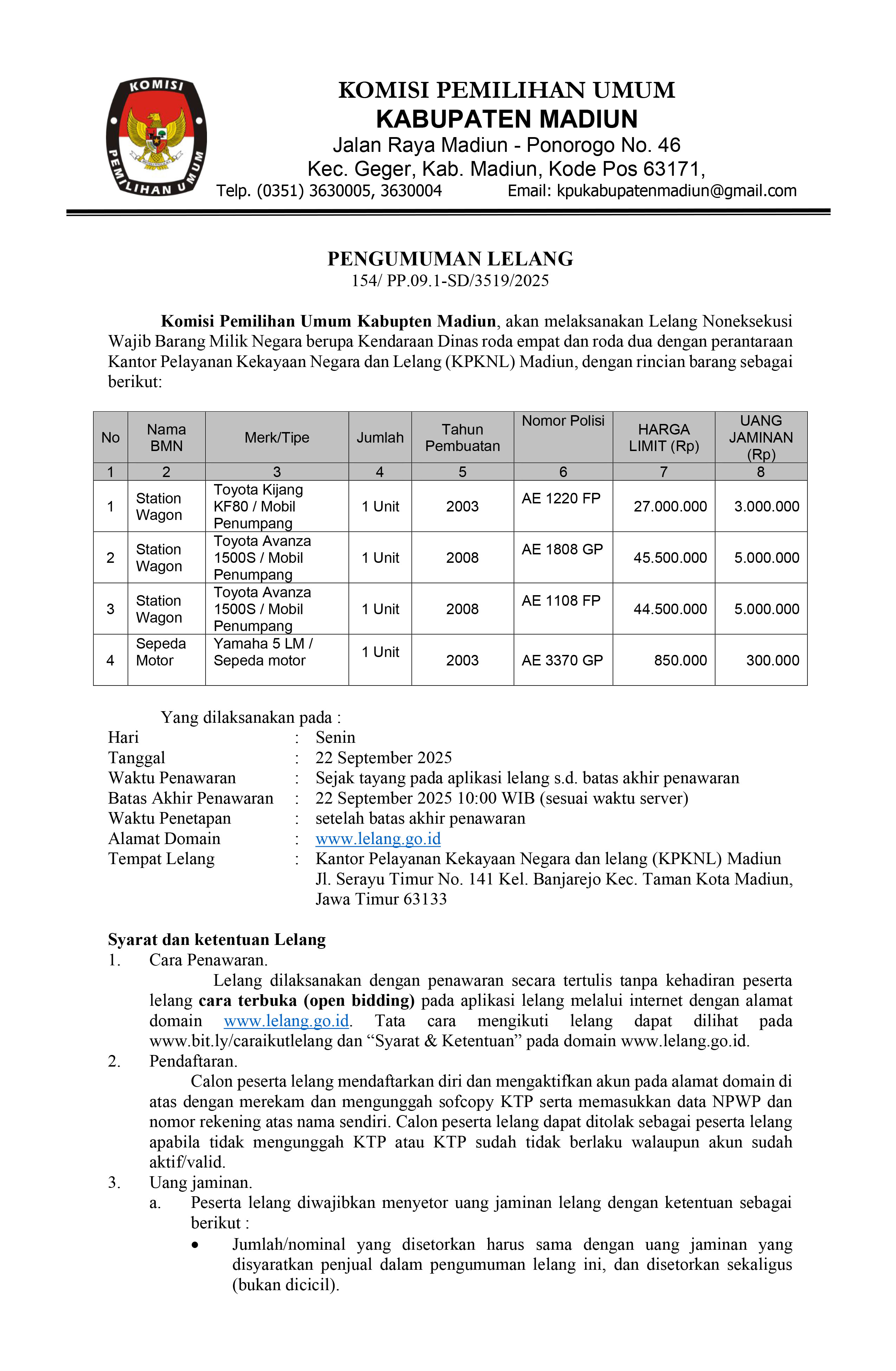 KPU Kabupaten Madiun melaksanakan penjualan kendaraan Roda Dua dan Roda Empat dengan cara lelang terbuka. Untuk pengumuman lengkapnya dapat di unduh di sini.