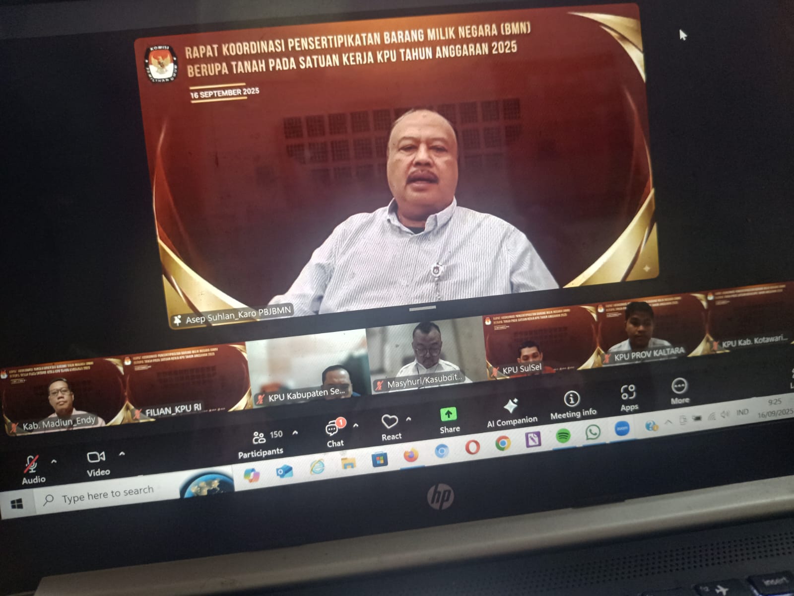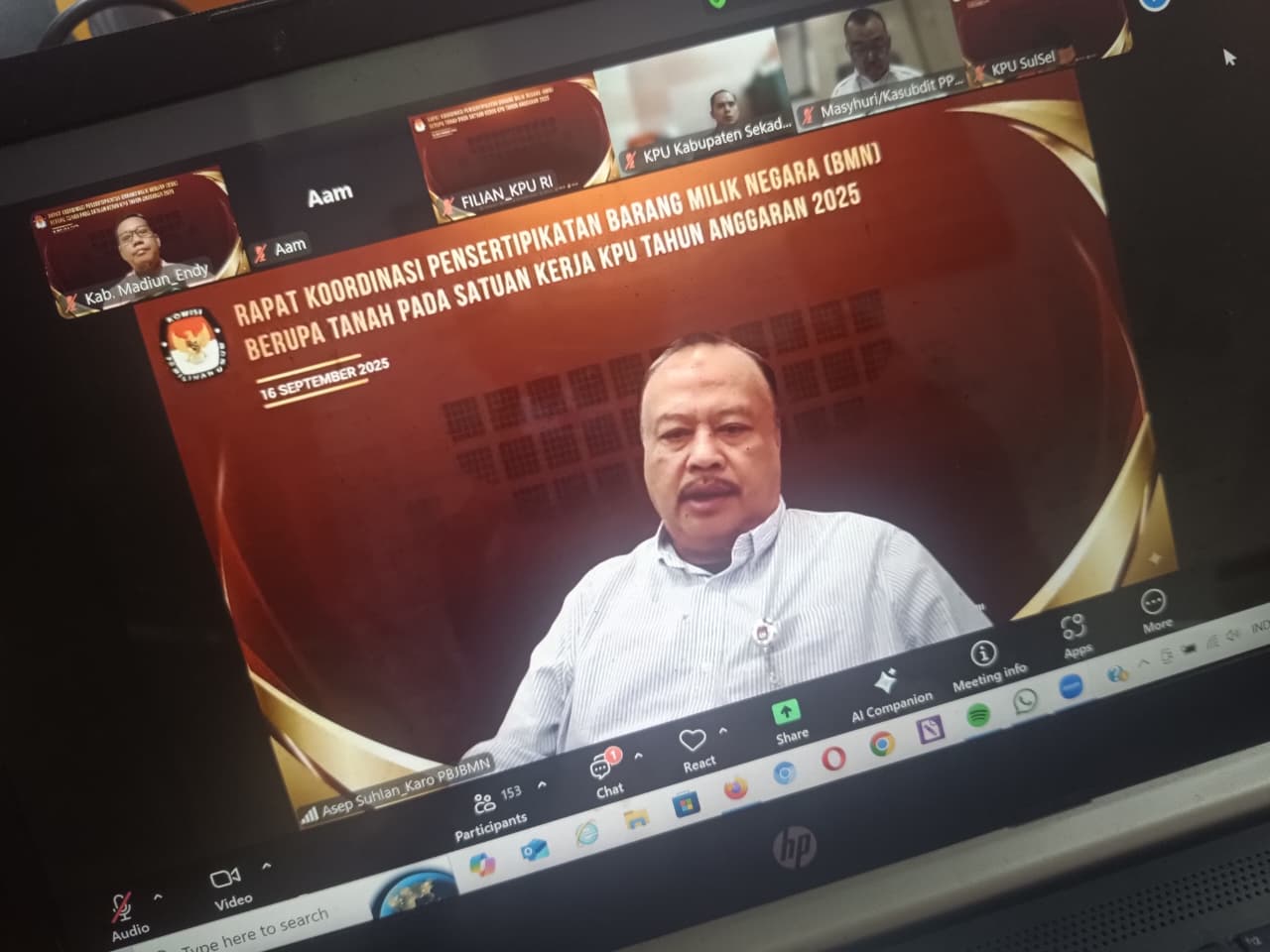 Madiun – Komisi Pemilihan Umum (KPU) Kabupaten Madiun mengikuti rapat koordinasi (rakor) pensertifikatan Barang Milik Negara (BMN) berupa tanah pada Satuan Kerja KPU Tahun Anggaran 2025, pada Selasa (16/09/2025). Kegiatan ini diadakan oleh KPU Republik Indonesia dan dilaksanakan secara daring melalui aplikasi Zoom serta diikuti oleh beberapa KPU Kabupaten/Kota di Indonesia.