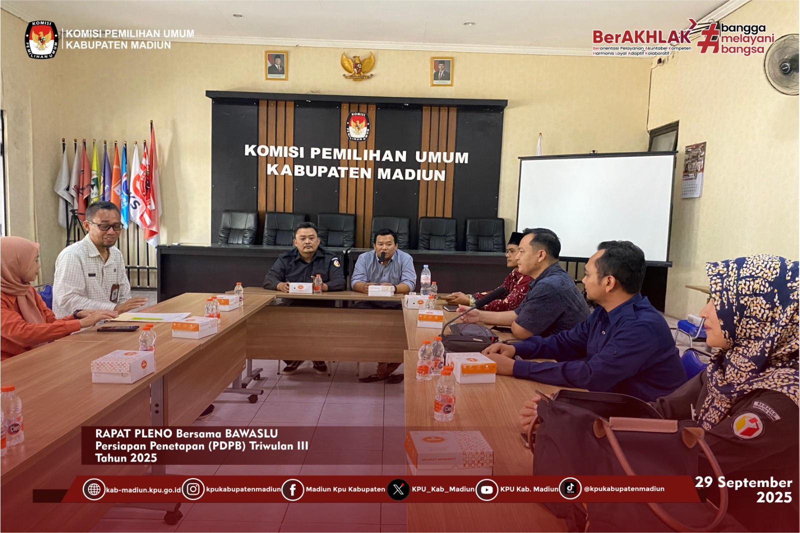 Madiun — Komisi Pemilihan Umum (KPU) Kabupaten Madiun menggelar Rapat Koordinasi Persiapan Pelaksanaan Rekapitulasi Pemutakhiran Data Pemilih Berkelanjutan (PPDB) Triwulan III Tahun 2025, Senin (29/9/2025), di ruang rapat kantor KPU Kabupaten Madiun.