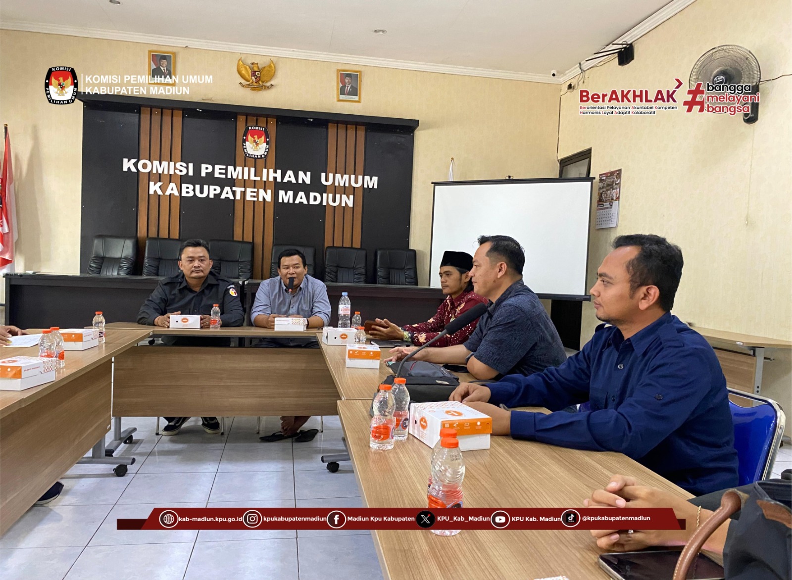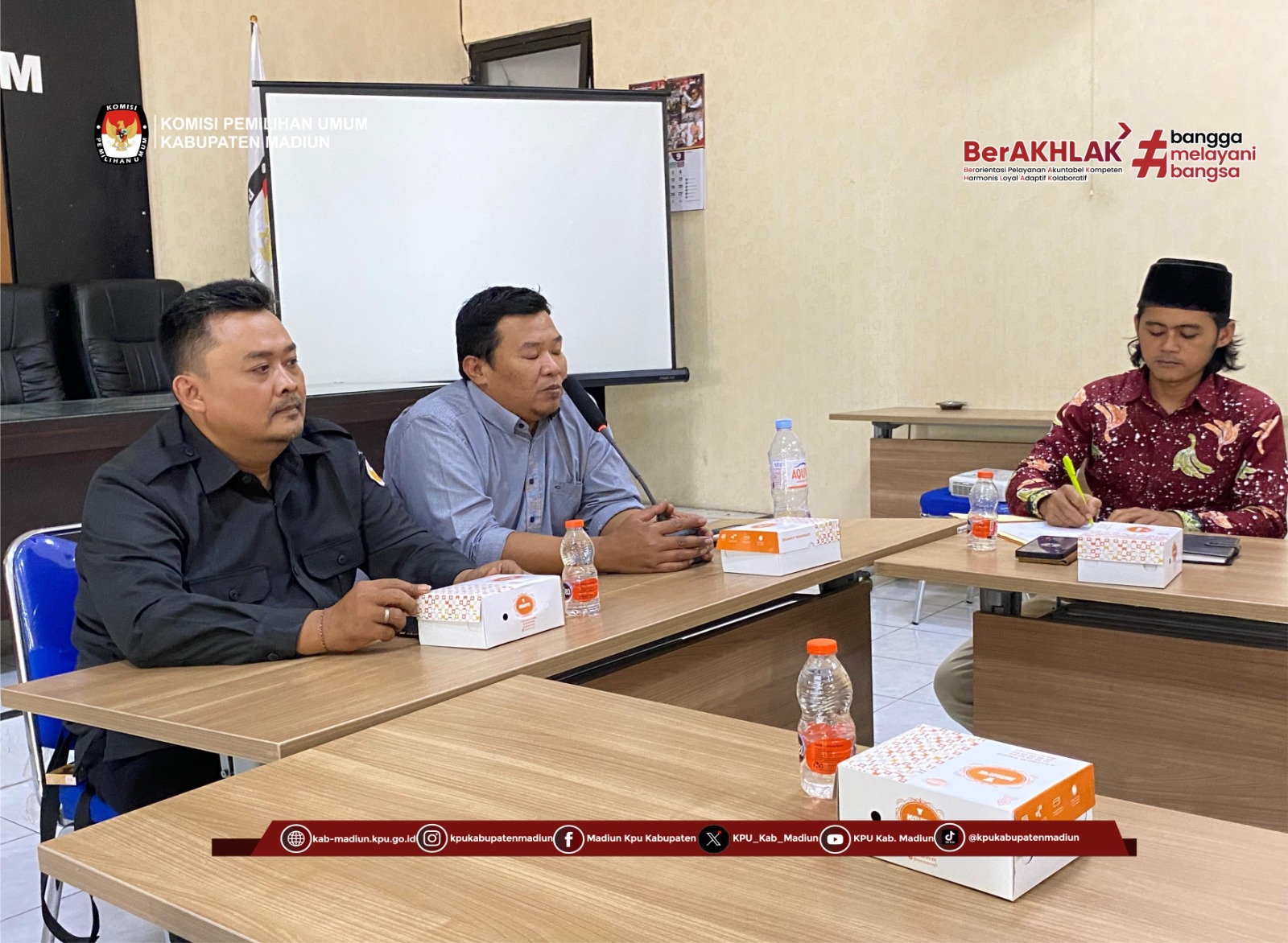 Rapat dipimpin langsung oleh Ketua KPU Kabupaten Madiun, Nur Anwar, dan dihadiri oleh jajaran komisioner KPU, komisioner Bawaslu Kabupaten Madiun, serta sekretaris dan kasubag sekretariat KPU Kabupaten Madiun.