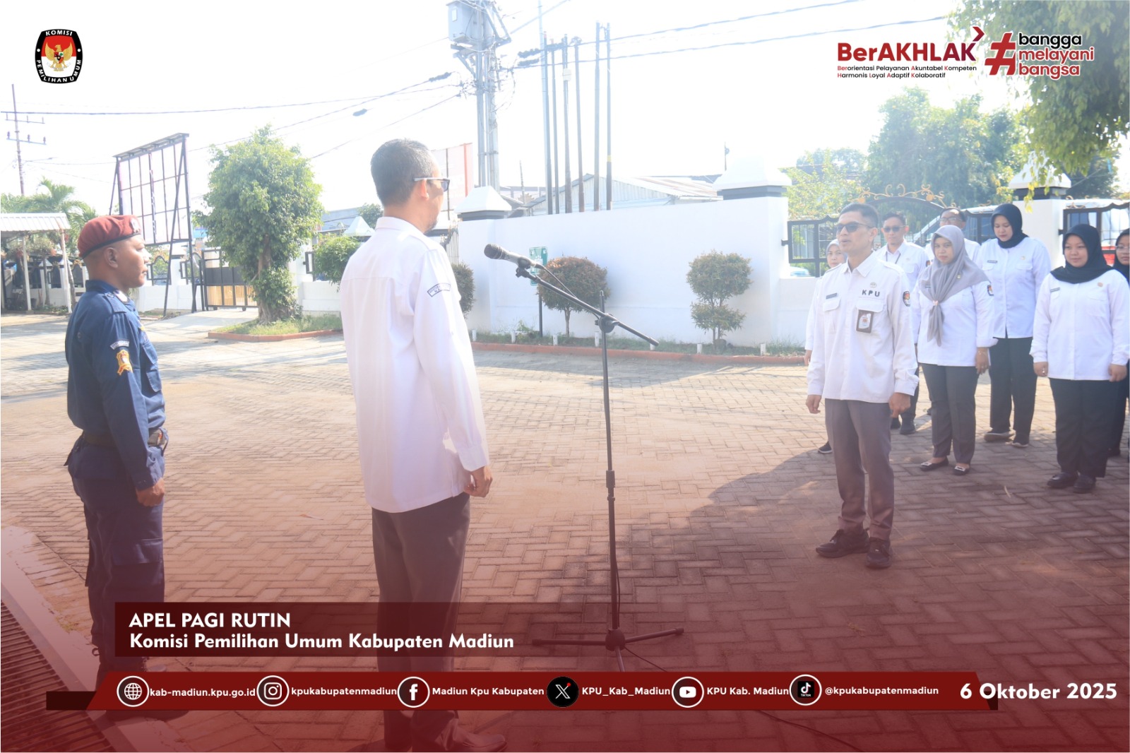 Madiun — Komisi Pemilihan Umum (KPU) Kabupaten Madiun melaksanakan apel rutin Senin pagi, pada 6 Oktober 2025, di halaman kantor KPU Kabupaten Madiun. Kegiatan apel berlangsung tertib dan khidmat dengan Pembina Apel Ardy Sugiarto, Kasubbag Perencanaan, Data, dan Informasi, serta Komandan Apel Aji Suprapto, staf Subbagian Perencanaan, Data dan informasi.