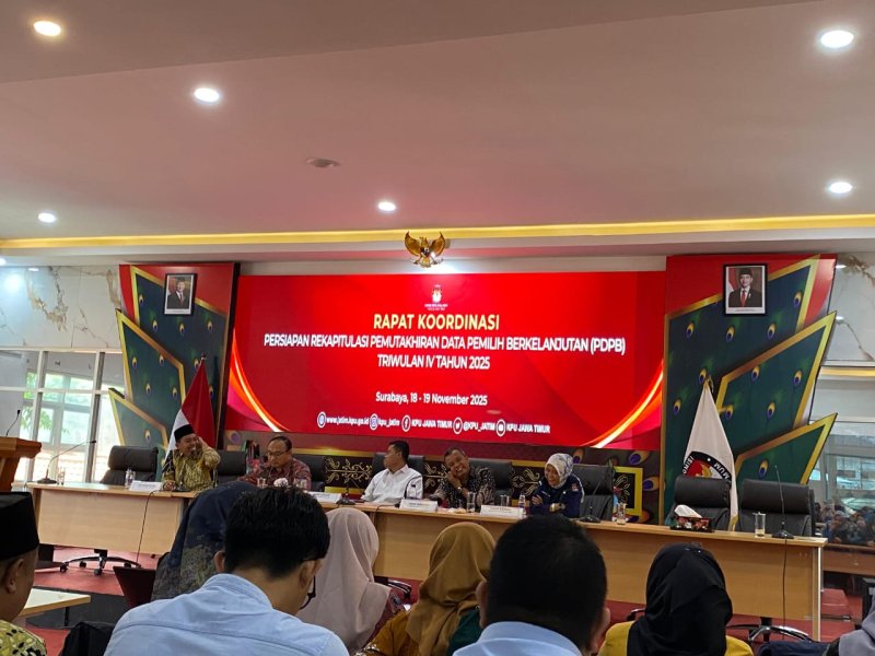 Madiun — Untuk memastikan pelaksanaan pemutakhiran data pemilih berkelanjutan berjalan sesuai regulasi, Komisi Pemilihan Umum (KPU) Kabupaten Madiun menghadiri Rapat Koordinasi (Rakor) Persiapan Rekapitulasi Pemutakhiran Data Pemilih Berkelanjutan Triwulan IV Tahun 2025 yang diselenggarakan oleh KPU Provinsi Jawa Timur. Kegiatan ini berlangsung pada Selasa–Rabu, 18–19 Oktober 2025.