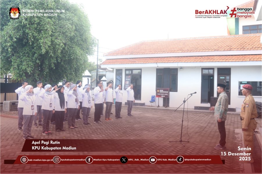 Madiun – Komisi Pemilihan Umum (KPU) Kabupaten Madiun melaksanakan apel pagi rutin pada Senin (15/12/2025) pukul 08.00 WIB di halaman Kantor KPU Kabupaten Madiun. Kegiatan ini diikuti oleh seluruh staf kesekretariatan, Anggota KPU Kabupaten Madiun, serta Sekretaris KPU Kabupaten Madiun.