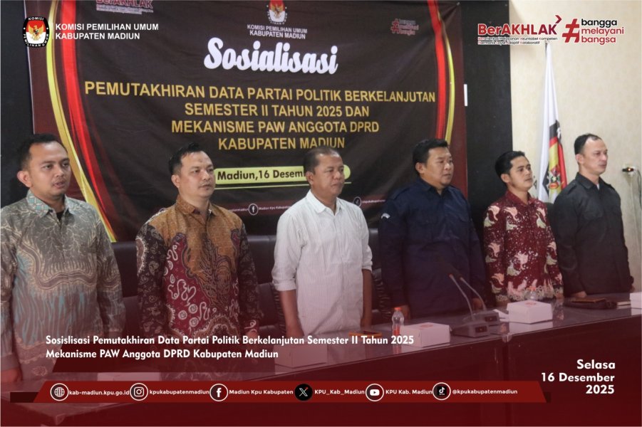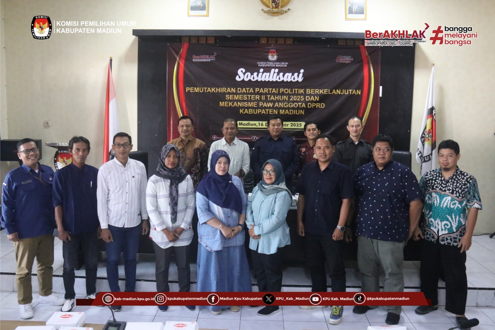 Madiun – Komisi Pemilihan Umum (KPU) Kabupaten Madiun menyelenggarakan Sosialisasi Pemutakhiran Data Partai Politik Berkelanjutan Semester II Tahun 2025 serta Mekanisme Pergantian Antar Waktu (PAW) Anggota DPRD Kabupaten Madiun pada Selasa (16/12/2025). Kegiatan ini dilaksanakan di Aula KPU Kabupaten Madiun pukul 13.00–15.30 WIB.