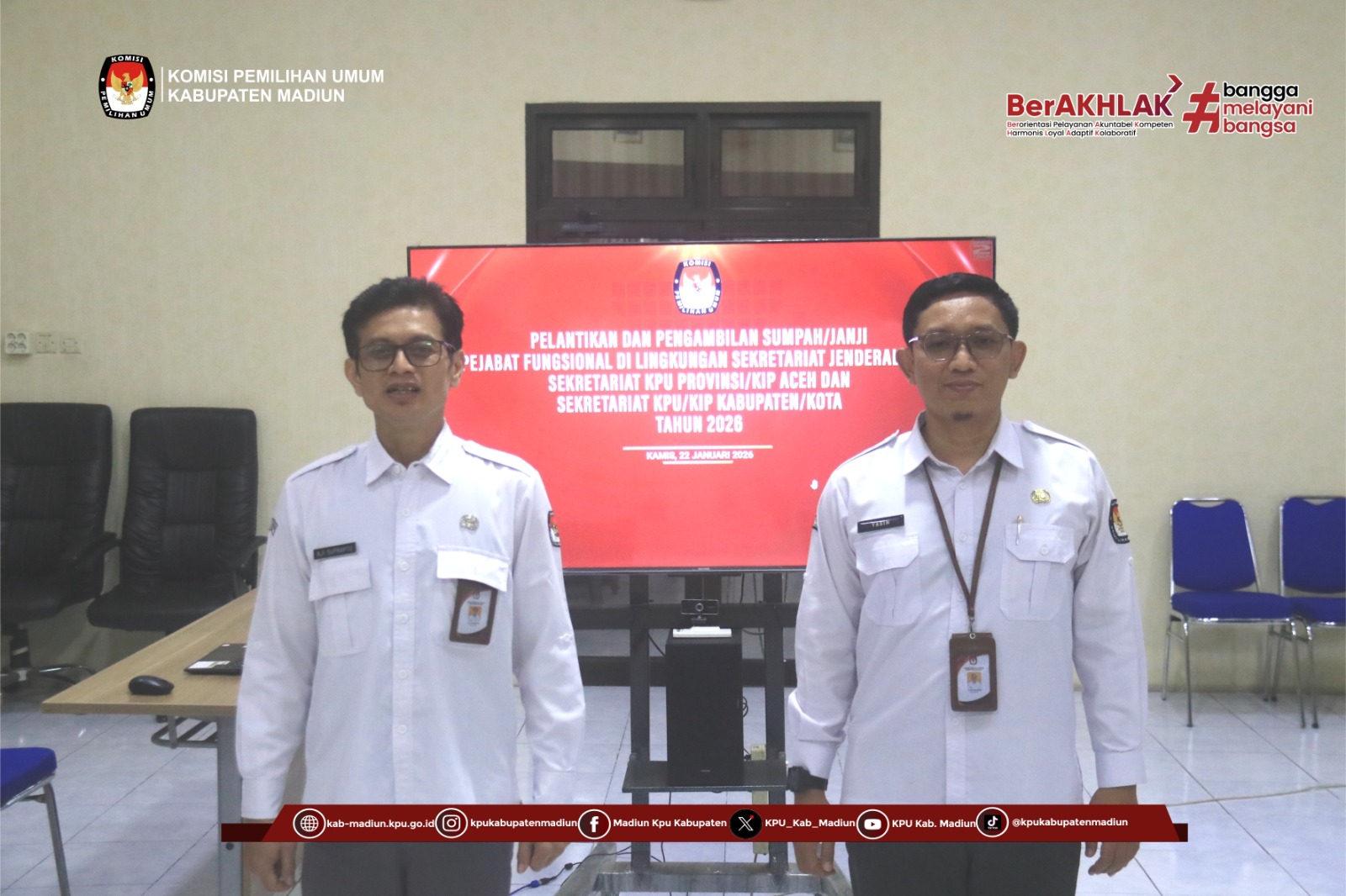 Sebagai bagian dari upaya tersebut, KPU Kabupaten Madiun mengikuti kegiatan Pelantikan dan Pengambilan Sumpah/Janji Pejabat Fungsional Penata Kelola Pemilihan Umum di lingkungan Sekretariat Jenderal KPU, Sekretariat KPU Provinsi/KIP Aceh, serta Sekretariat KPU/KIP Kabupaten/Kota Tahun 2026. Kegiatan ini dilaksanakan secara daring pada Kamis (22/1/2026).