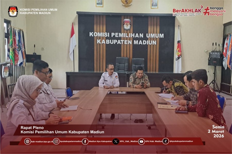 Madiun – Komisi Pemilihan Umum (KPU) Kabupaten Madiun menggelar rapat pleno pada Senin (2/3/2026) di Aula Kantor KPU Kabupaten Madiun. Rapat ini menjadi forum koordinasi internal untuk membahas sejumlah agenda kerja pada pekan pertama Maret.