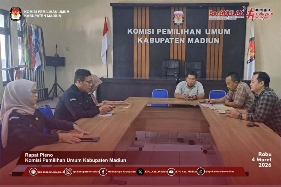 Madiun — Komisi Pemilihan Umum (KPU) Kabupaten Madiun menggelar rapat pleno pada Selasa (4/3/2026) di kantor setempat untuk membahas laporan bulanan Sistem Pengendalian Intern Pemerintah (SPIP). Kegiatan ini diikuti jajaran komisioner, sekretariat, serta staf terkait.