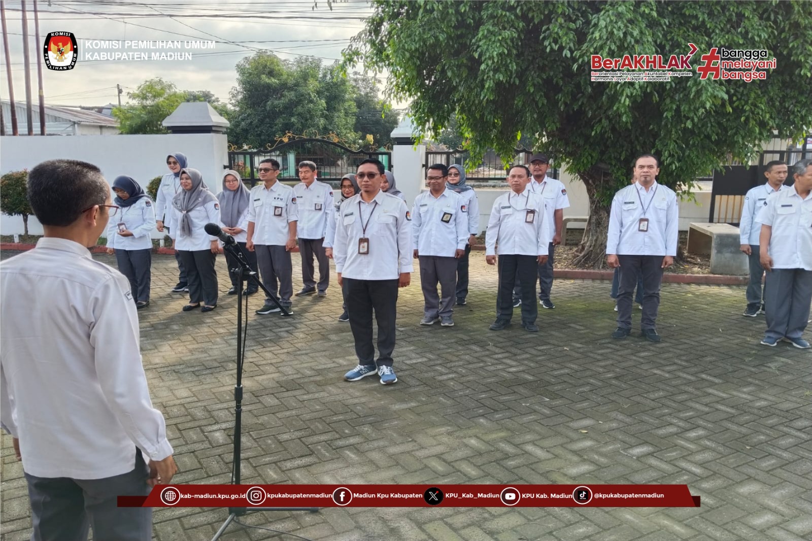 Madiun – KPU Kabupaten Madiun menggelar apel rutin pada Senin (9/3/2026) pagi di halaman kantor setempat. Apel ini diikuti seluruh pegawai sebagai upaya memperkuat kedisiplinan dan koordinasi internal.