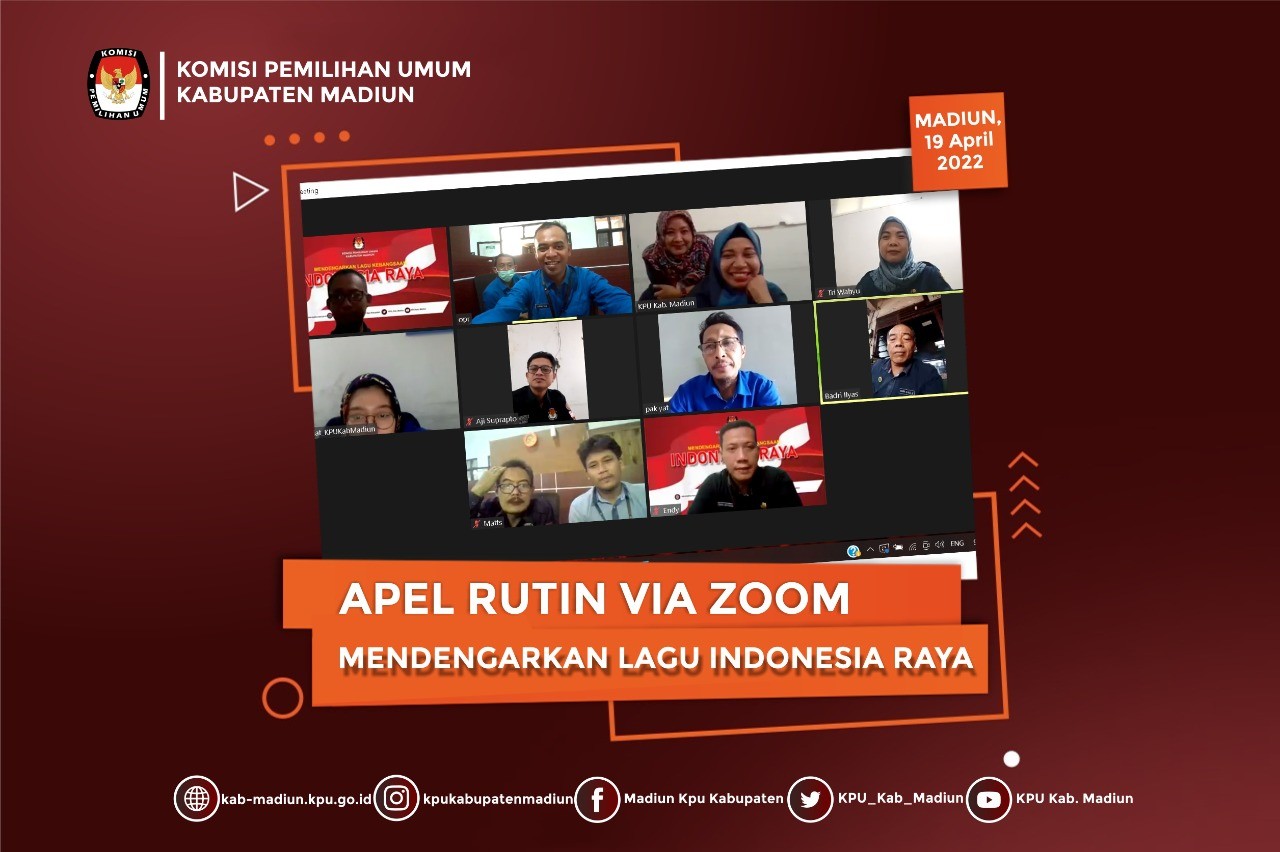 Madiun, http://kab-madiun.kpu.go.id Hari ini dilaksanaanya kegiatan Apel pagi secara daring yang dimulai pukul 09.30 WIB. kali ini dipimpin oleh Kepala Subbagian Program Dan Data Ardy Sugiarto dengan peserta seluruh staf sekretariat KPU kabupaten Madiun. Apel pagi ini untuk mendengarkan bersama sama Lagu Indonesia Raya yakni berguna untuk mempupuk rasa cinta terhadapa negara Indonesia. setelah kegiatan selesai, diakhir dengan doa bersama dan melanjutkan kinerja masing masing.