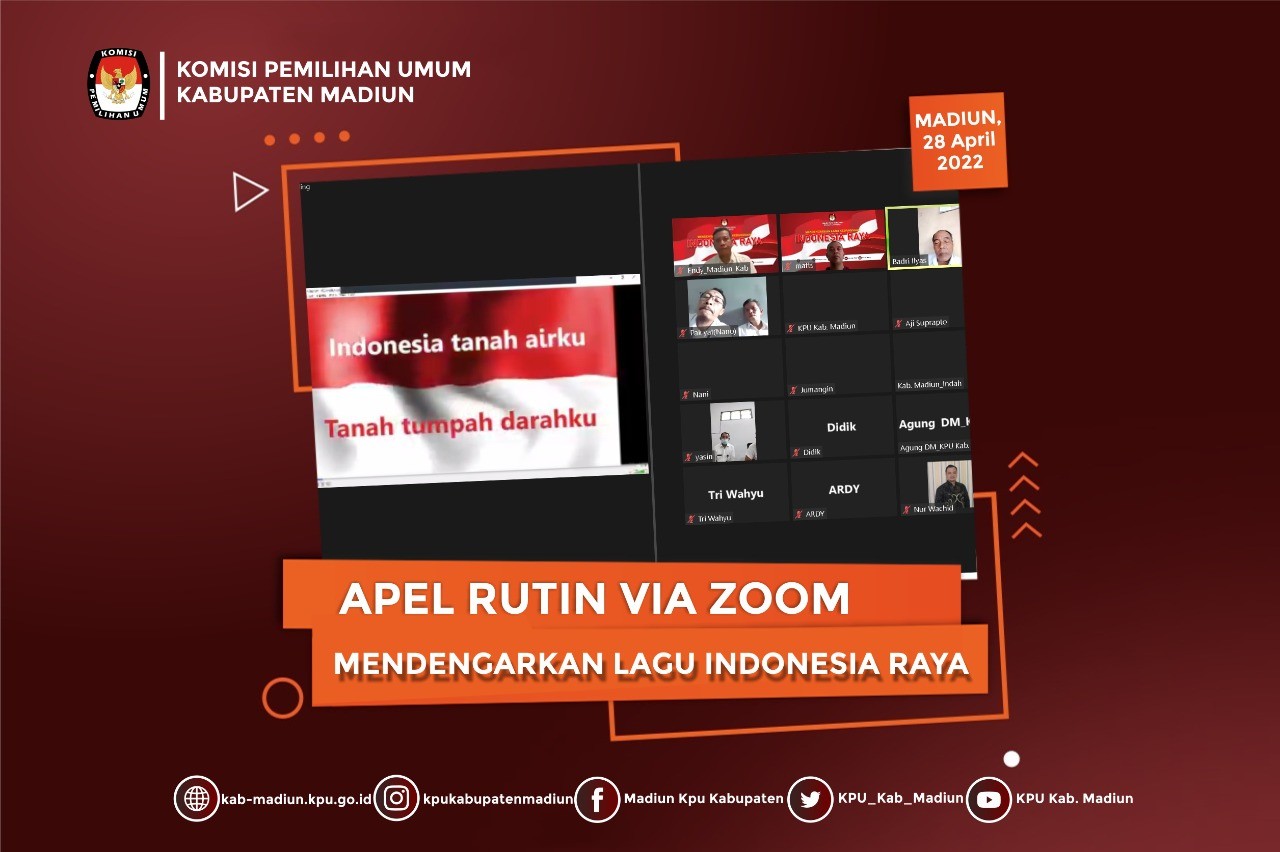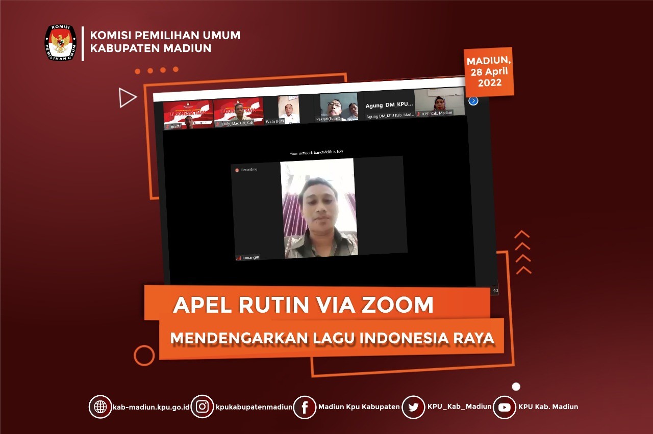 Madiun, http://kab-madiun.kpu.go.id Seluruh personel KPU Kabupaten Madiun awali kegiatan hari ini dengan laksanakan apel rutin untuk Mendengarkan Lagu Indonesia Raya yang kali ini dipimpin oleh Komisioner Divisi Teknis Penyelenggara Jumangin. Kegiatan apel rutin ini dilaksanakan selama pandemi masing berlangsung, selain membina kekompakan dan rasa cinta dan bangga kepada negara indonesia kegiatan ini juga untuk menjaga kedisplinan bagi setiap personel KPU Kabupaten Madiun.