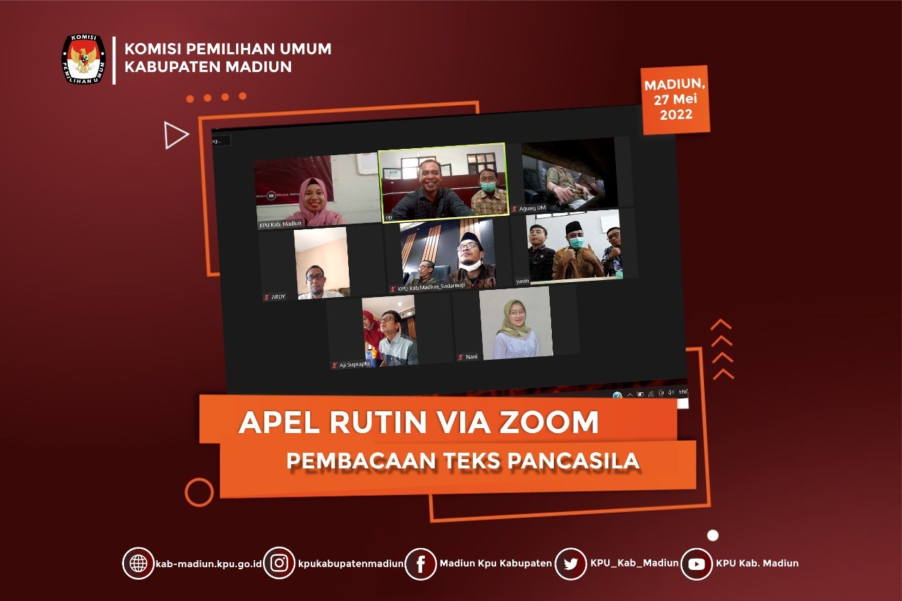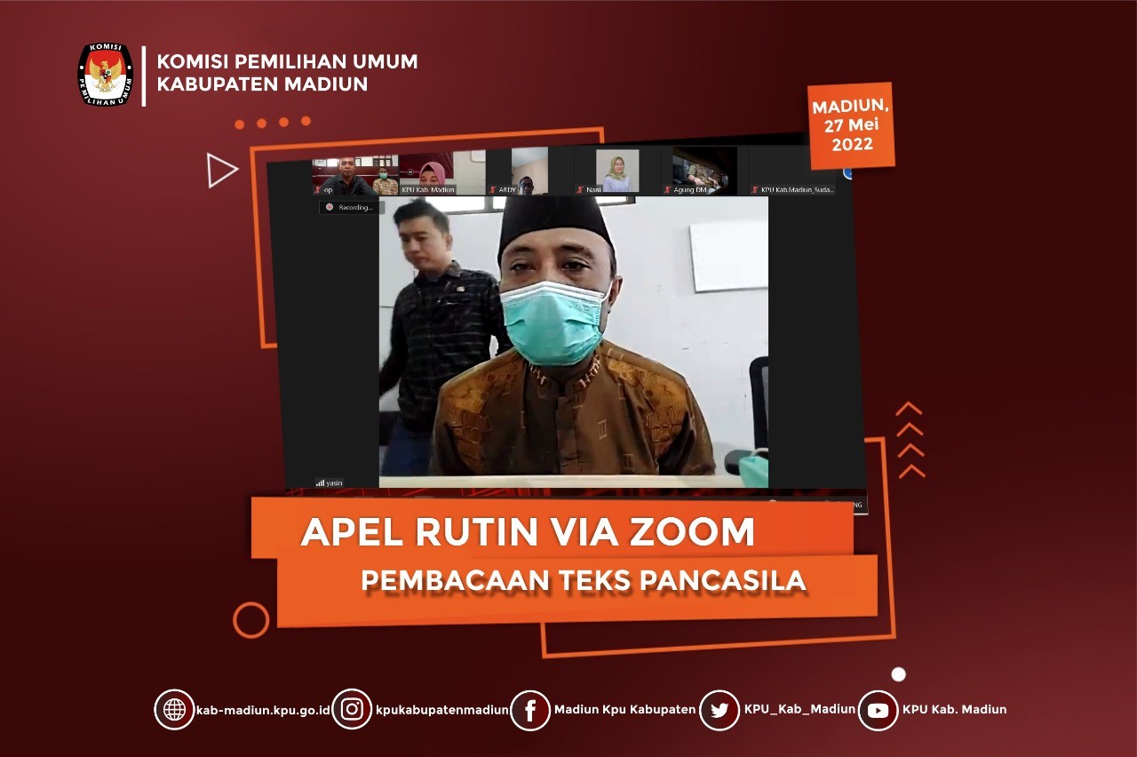 Madiun, http://kab-madiun.kpu.go.id KPU Kabupaten Madiun pagi ini awali kegiatan dengan Apel Rutin yang dilaksanakan via Daring. Kali ini dipimpin oleh Kasubbag Teknis dan Hubmas Pujo Lambang Pamungkas dengan peserta seluruh personel KPU Kabupaten Madiun, Kegiatan Daring ini yakni Pembacaan Teks Pancasila yang dilakukan secara bersama sama, dengan dilaksanakannya kegiatan ini diharapkan Personel KPU Kabupaten Madiun tetap menjaga kekompakan dan kedisplinan selama menjalankan tugas dan tanggung jawab yang sebentar lagi juga akan memasuki Tahapan Pemilu Serentak 2024.