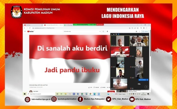 Madiun, http://kab-madiun.kpu.go.id Komisi Pemilihan Umum Kabupaten Madiun laksanakan Rutinitas Mendengarkan Lagu Indonesia Raya sebelum menngerjakan tugas dan tanggung jawab yang diberikan. Kegiatan ini dimulai pukul 09.30 yang kali ini dipimpin oleh Plt Kasubbag Keuangan Umum dan Logistik Sudarmaji Ariwibowo dengan peserta seluruh Komisioner dan Seluruh Staf Sekretariat KPU Kabupaten Madiun. Kegiatan yang dilaksanakan Via Daring Melalui Aplikasi Zoom Meeting ini guna untuk menumbuhkan cinta kepada negara indonesia dan membina kekompakan sesama personel KPU Kabupaten madiun.