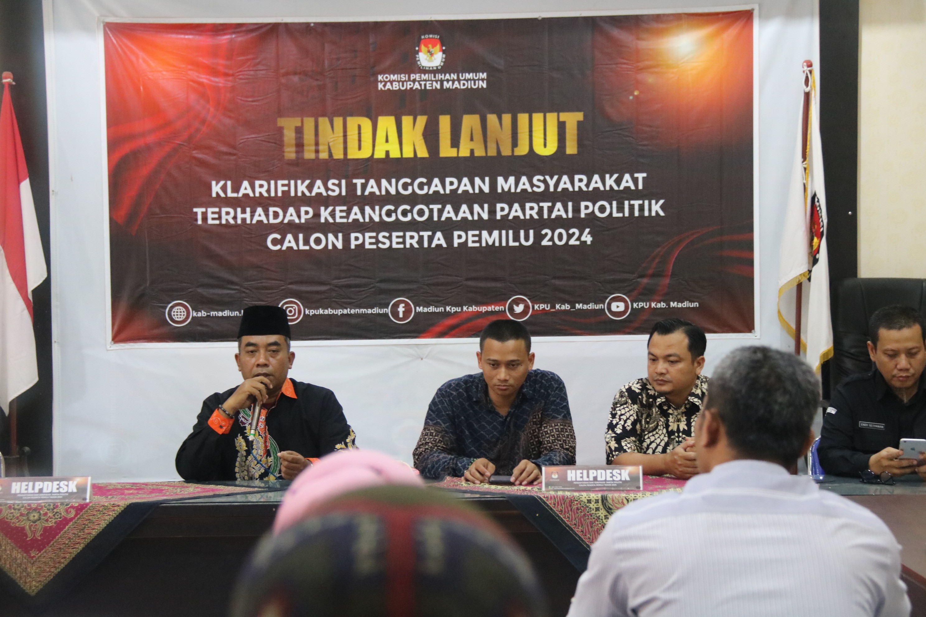 Komisioner Divisi Teknis Penyelenggaraan Jumangin menyampaikan Dalam undangan terkait dengan Klarifikasi Tanggapan Masyarakat ini, Tujuan dari KPU Kabupaten Madiun untuk mempertemukan dari pihak partai politik dan masyarakat umum untuk sama sama klarifikasi data pada masyarakat umum yang tercantum dalam partai politik.