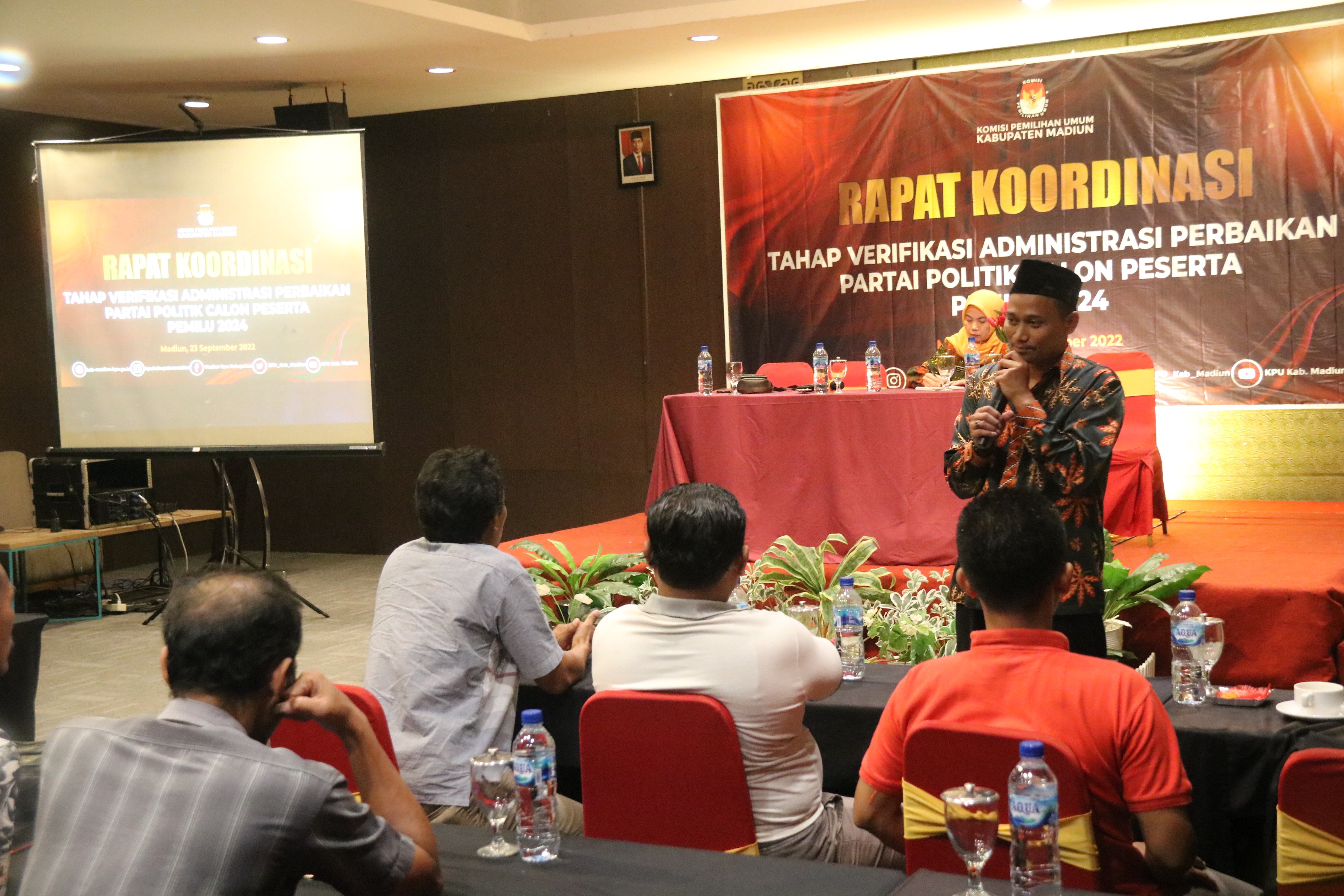 Kegiatan Rakor yang bertempat di Ruang Rapat Iclub Kota Madiun ini dilaksanakan dengan tujuan pada Tahapan Verifikasi Administrasi Perbaikan ini mengerti dan memahami terkait pelaksanaan tindak lanjut berikutnya yang harus dilaksanakan seluruh pihak partai Politik. Komisioner Divisi Teknis Penyelenggaraan Jumangin selaku pemateri dalam kegiatan rakor tersebut, memaparkan seluruh materi , beserta alur setelah tindak lanjut verifikasi administrasi yang lalu. Kegiatan Rakor ini diakhiri dengan diskusi bersama dengan partai politik.