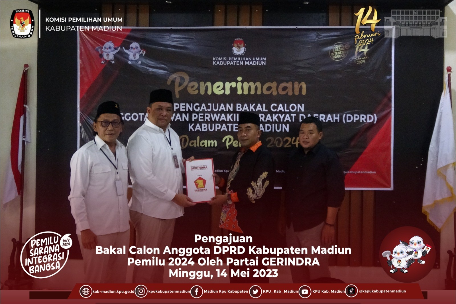 Madiun, http://kab-madiun.kpu.go.id Siang ini 14 Mei 2023 Pukul 14.15 WIB DPC Partai Gerakan Indonesia Raya (GERINDRA) melaksanakan pengajuan bakal calon DPRD Kabupaten Madiun. Dipimpin oleh Ketua DPC Partai Gerakan Indonesia Raya (GERINDRA) Rio Wing Dinaryhadi. ST datang ke Kantor KPU Kabupaten Madiun untuk mengajukan pendaftaran bakal calon DPRD Kabupaten Madiun.