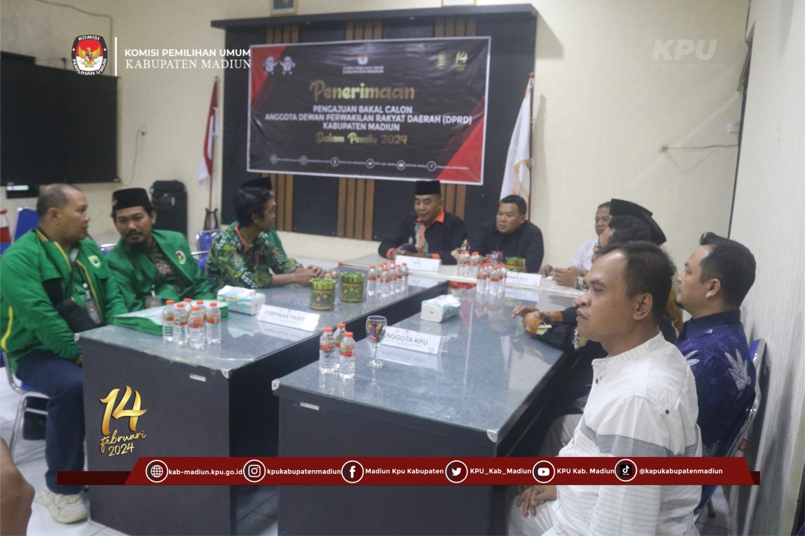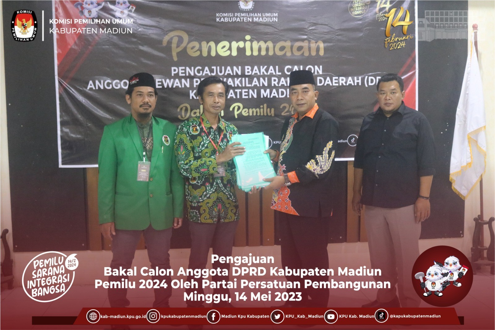 Kedatangan DPC Partai Persatuan Pembangunan (PPP) ditemui langsung oleh Ketua KPU Kabupaten Madiun Ali Nur Wahyudi dengan seluruh Anggota Komisioner ( Jumangin, Tri Haryono, Nur Wachid Nasrulloh, Fahim Amrillah). Dilakukan pengecekan data pada aplikasi SILON oleh operator berikut dilanjutkan dengan penyerahan BA ke DPC Partai Persatuan Pembangunan (PPP) sebagai tanda terima sudah mengajukan Bakal Calon DPRDnya ke KPU Kabupaten Madiun. Seluruh alur kegiatan pendaftaran ini juga didampingi dengan Bawaslu Kabupaten Madiun.