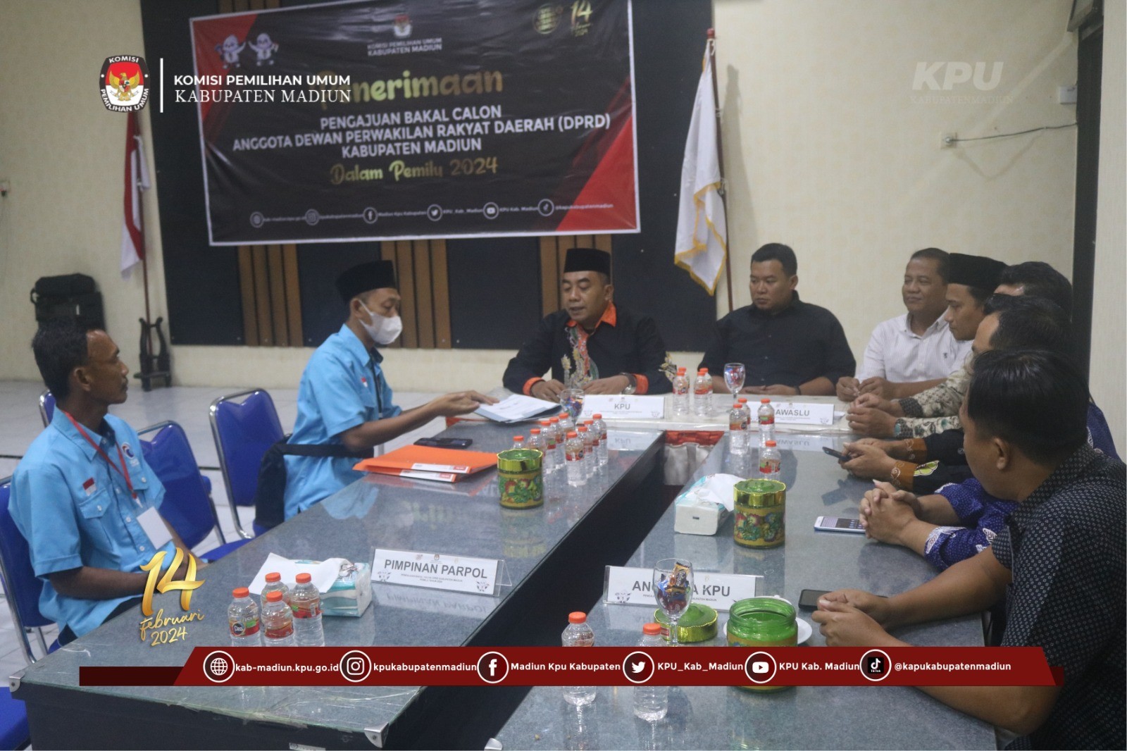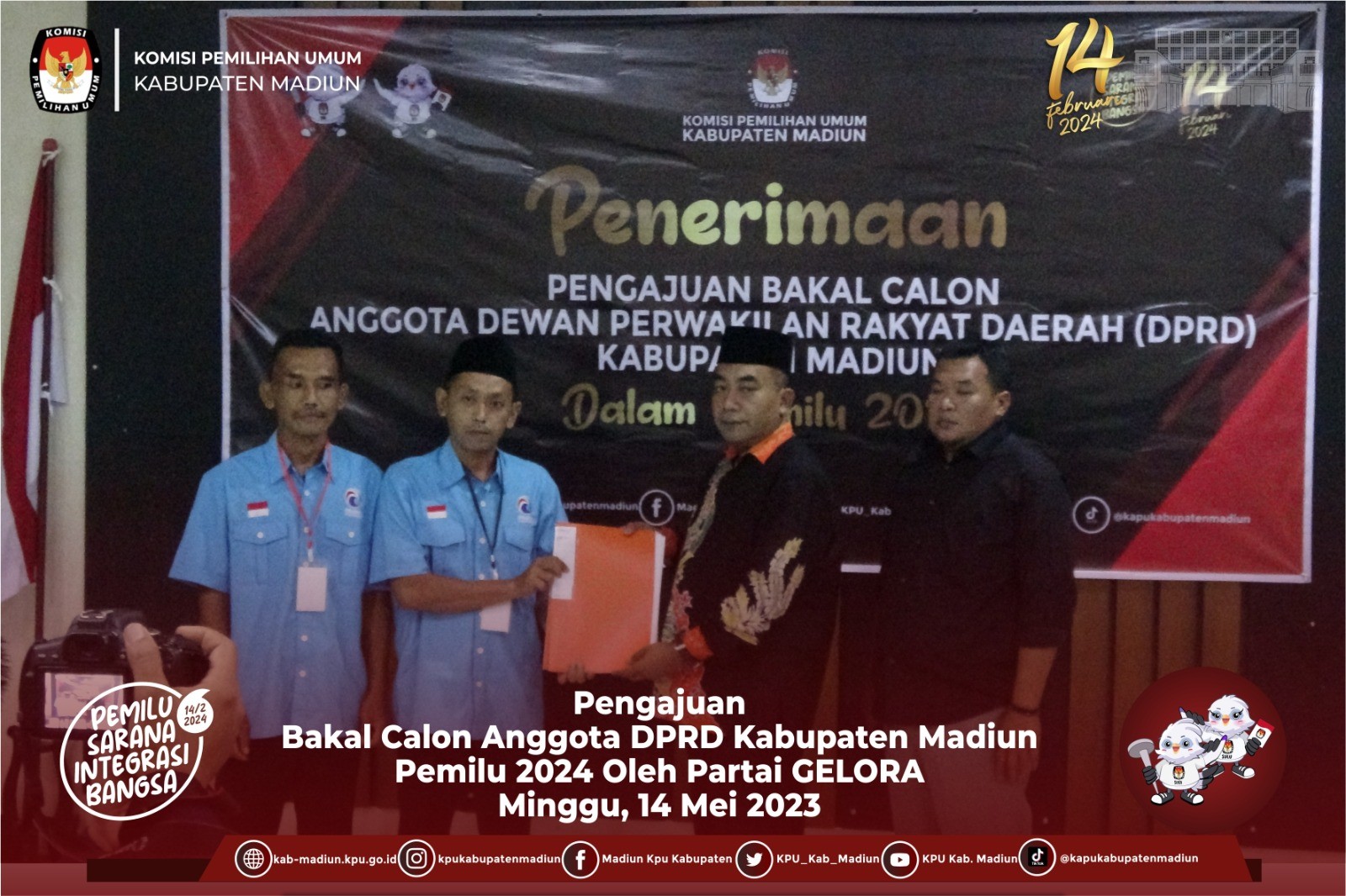 Kedatangan DPD Partai Gelombang Rakyat Indonesia (Gelora Indonesia) ditemui langsung oleh Ketua KPU Kabupaten Madiun Ali Nur Wahyudi dengan seluruh Anggota Komisioner ( Jumangin, Tri Haryono, Nur Wachid Nasrulloh, Fahim Amrillah). Dilakukan pengecekan data pada aplikasi SILON oleh operator berikut dilanjutkan dengan penyerahan BA ke DPD Partai Gelombang Rakyat Indonesia (Gelora Indonesia) sebagai tanda terima sudah mengajukan Bakal Calon DPRDnya ke KPU Kabupaten Madiun. Seluruh alur kegiatan pendaftaran ini juga didampingi dengan Bawaslu Kabupaten Madiun.