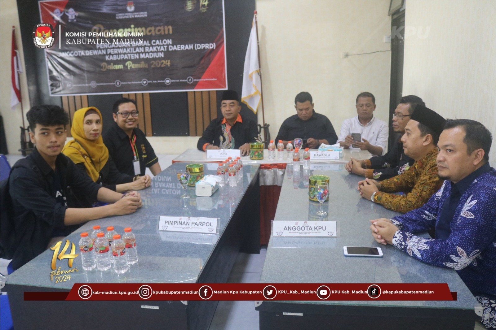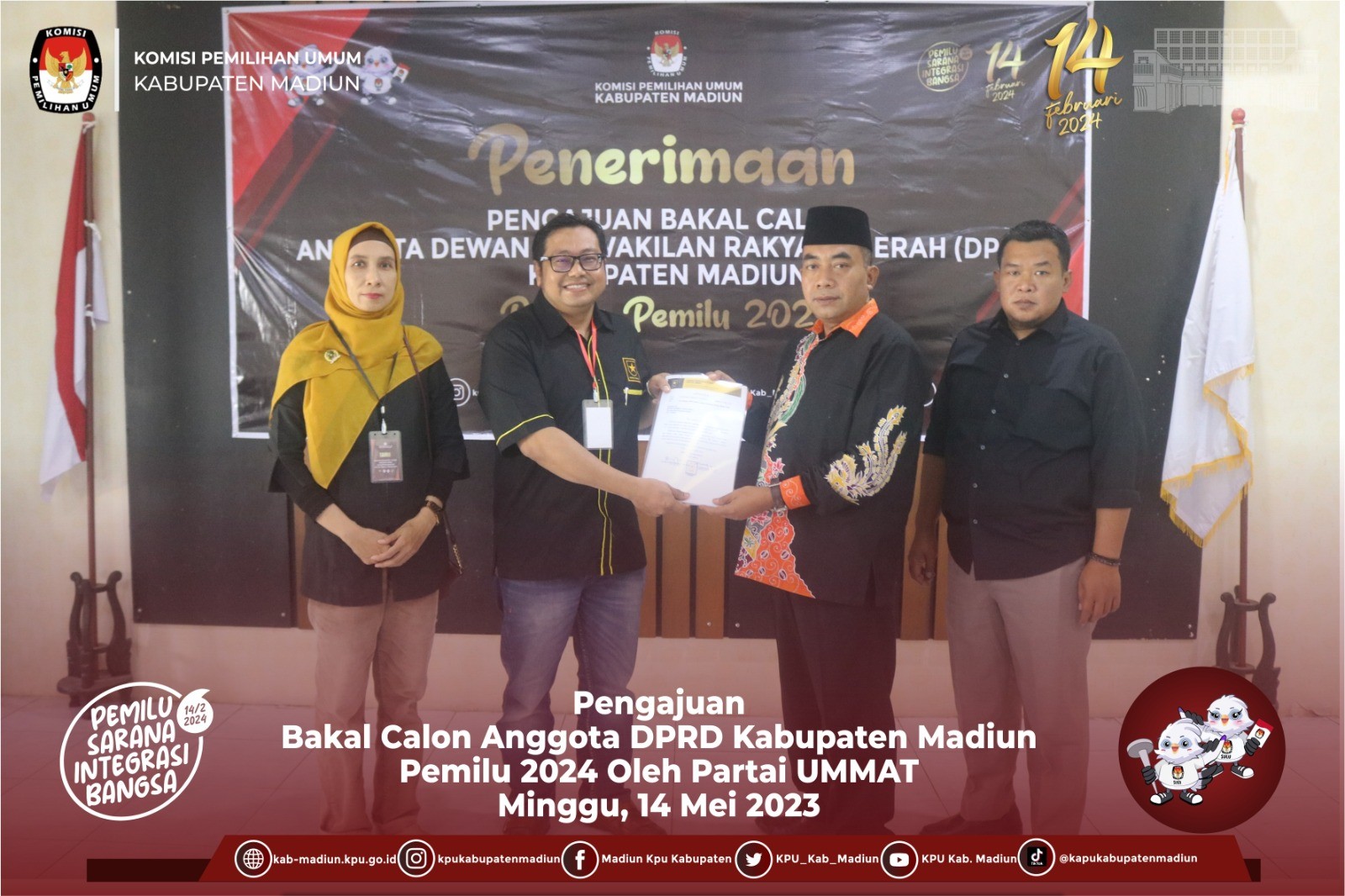 Kedatangan DPD Partai Ummat ditemui langsung oleh Ketua KPU Kabupaten Madiun Ali Nur Wahyudi dengan seluruh Anggota Komisioner ( Jumangin, Tri Haryono, Nur Wachid Nasrulloh, Fahim Amrillah). Dilakukan pengecekan data pada aplikasi SILON oleh operator berikut dilanjutkan dengan penyerahan BA ke DPD Partai Ummat sebagai tanda terima sudah mengajukan Bakal Calon DPRDnya ke KPU Kabupaten Madiun. Seluruh alur kegiatan pendaftaran ini juga didampingi dengan Bawaslu Kabupaten Madiun.