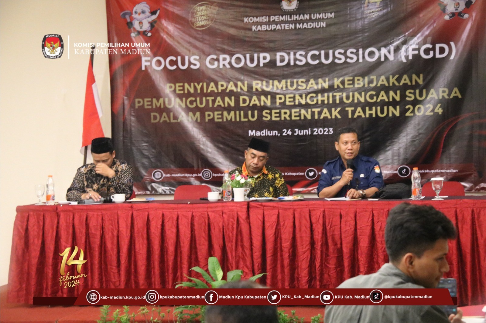 Acara yang dimulai pukul 14.00 WIB ini dibuka langsung oleh Ketua KPU Kabupaten Madiun Ali Nur Wahyudi yang menyampaikan dalam forum ini seluruh perserta baik dari bawaslu, PPK maupun Pihak Partai Politik bisa berpendapat dan berpandangan pada pengalaman pelaksanaan pemilu-pemilu sebelumnya. Dan hasilnya nanti akan di sampaikan dalam FGD bersama KPU RI melalui KPU Provinsi Jawa Timur.
