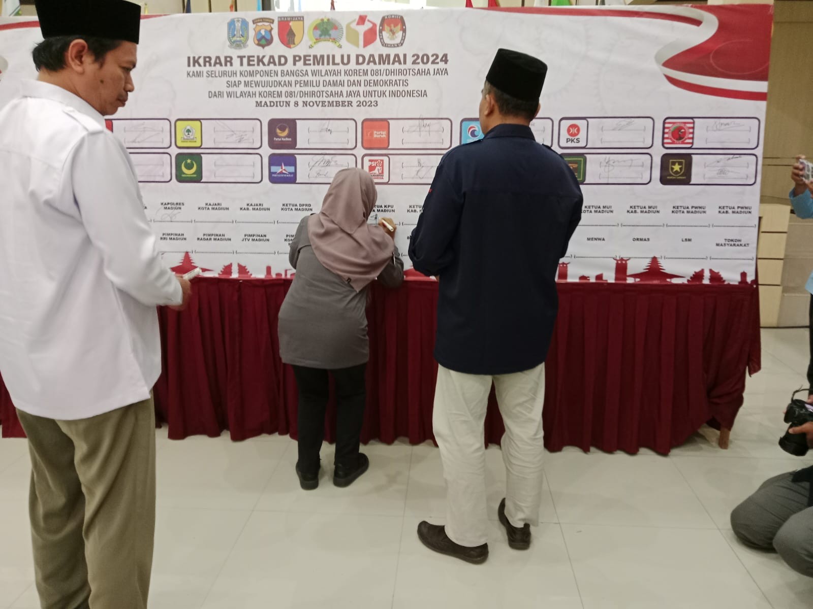 Dalam kegiatan ini Ketua KPU Kabupaten Madiun Ali Nur Wahyudi di beri kesempatan Memberikan Sambutan sebagai penyelenggara Pemilu. Berikut setelah dengan rankaian Acara pelaksanaan Penandatanganan Ikrar Tekad Pemilu Damai Tahun 2024 dilaksanakan dengan Lancar dan selesai pukul 11.00 WIB