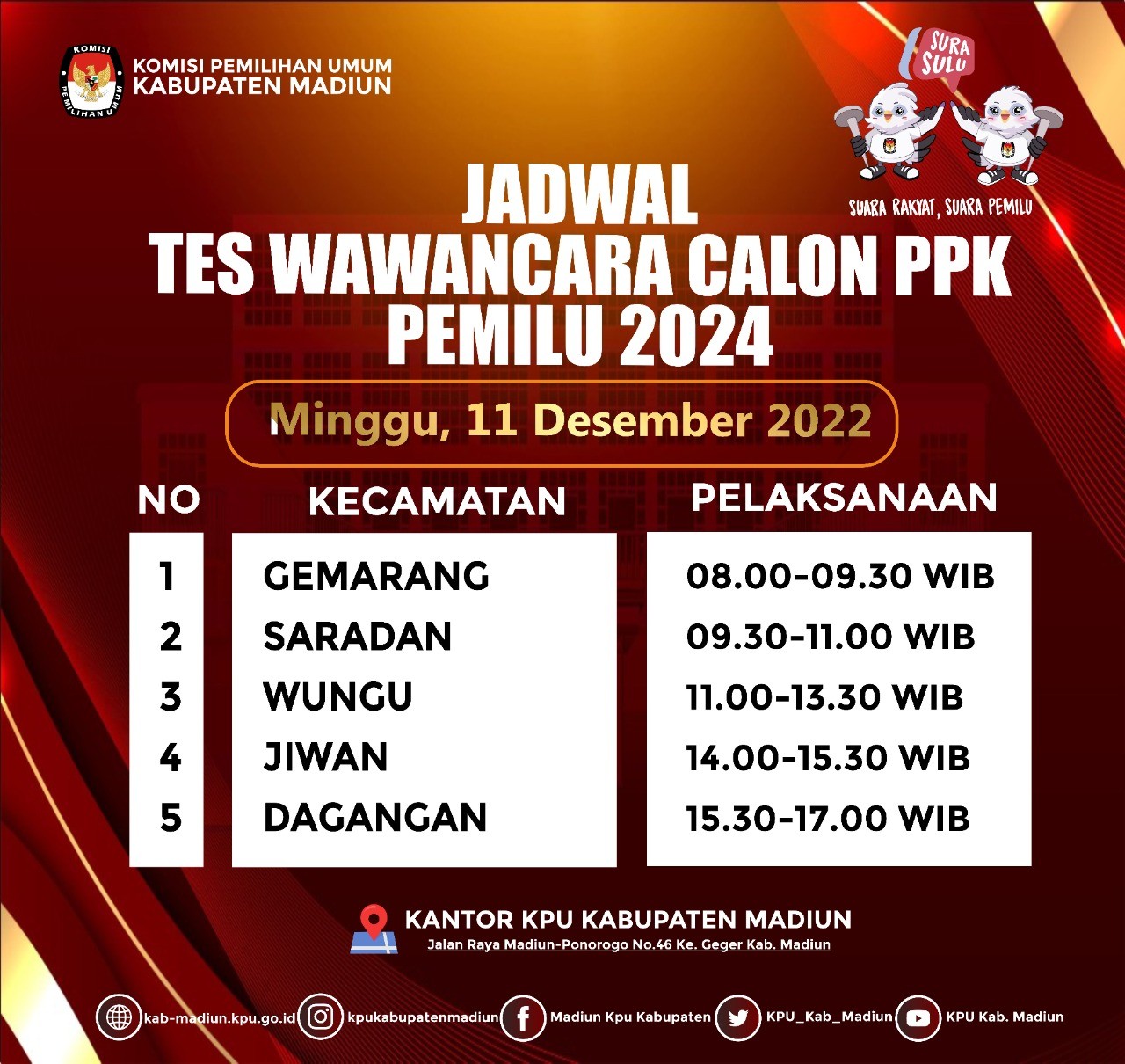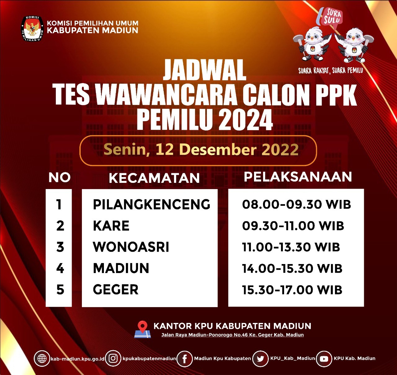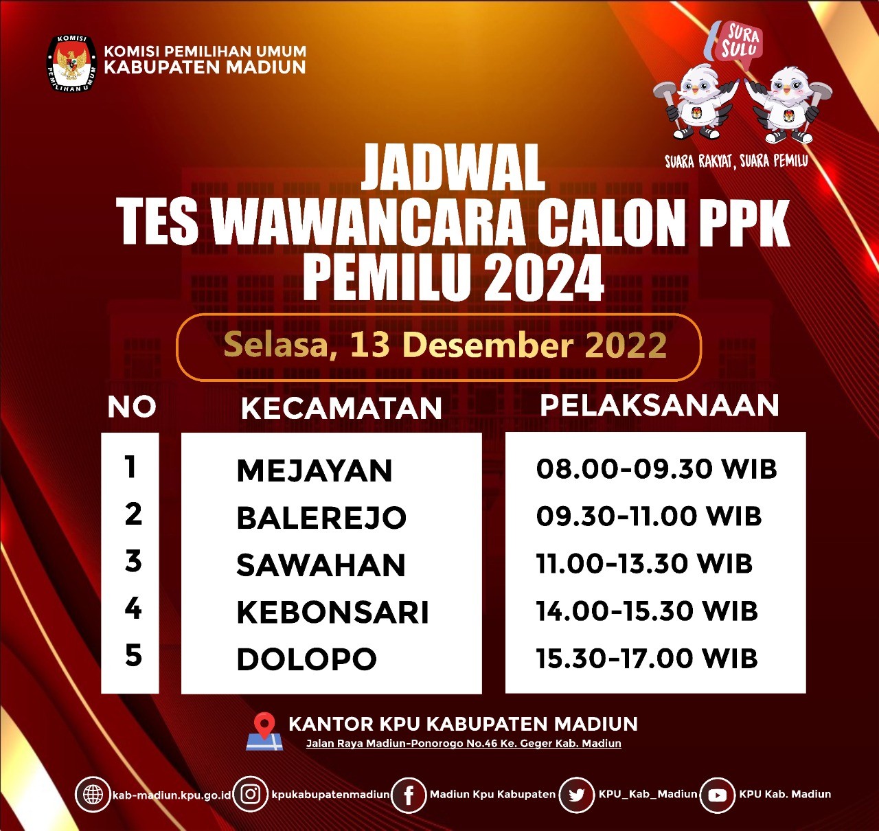 Madiun, 8/12/22; Berikut ini jadwal pelaksanaan test wawancara calon anggota PPK Pemilihan Umum Tahun 2024