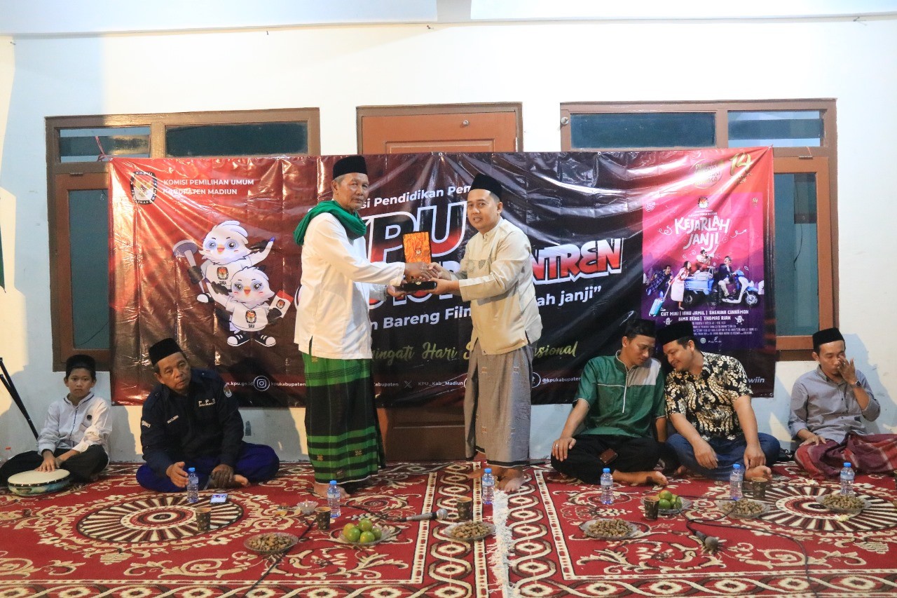 Madiun, http://kab-madiun.kpu.go.id Hari ini KPU Kabupaten Madiun adakan kegiatan Sosialisasi Pendidikan Pemilih yakni dengan tema "KPU Goes to Pesantren" yang dibungkus dalam rangkaian acara Nonton Bareng Film Kejarlah Janji. Kegiatan yang dilaksanakan di Pondok Pesantren Tarbiyatul Muthatowwin Rejosari yang berada di kecamatan Kebonsari Kabupaten Madiun. Kegiatan ini dilaksanakan mulai pukul 19.00 WIB yang diawali dengan menyanyikan lagu indonesia raya dan jingle pemilu 2024. Turut hadir dalam giat Sosialisasi ini yakni Komisioner Divisi Sosdiklih Parmas dan SDM Fahim Amrillah, Komisioner Divisi Teknis Penyelenggaraan Jumangin, dan Komisioner Divisi Rendatin Nur Wachid Nasrulloh, Selaku Pimpinan dan Pengurus Pondok Pesantren dan Juga Seluruh PPK Kecamatan Kebonsari dan Seluruh PPS Rejosari.