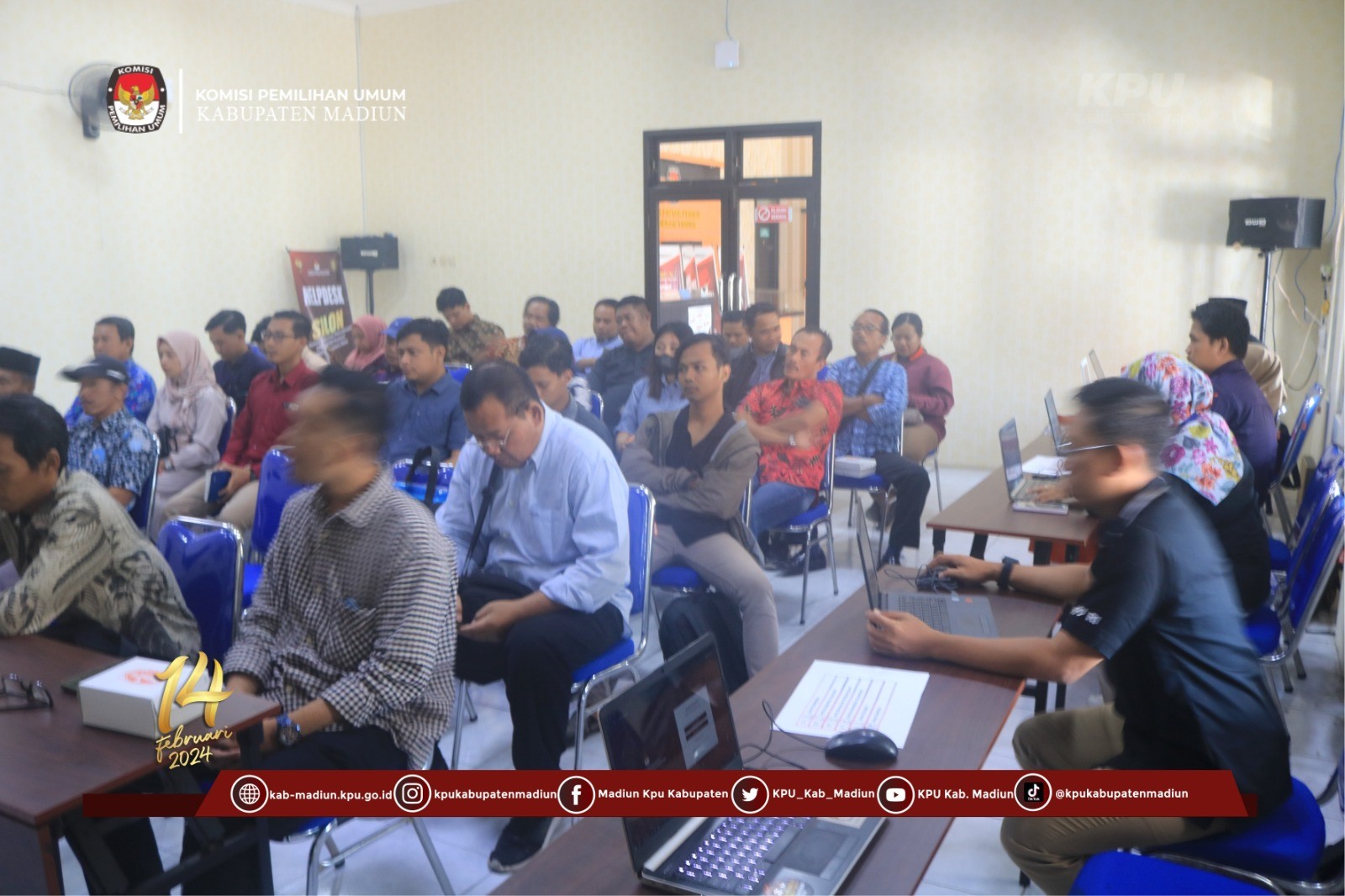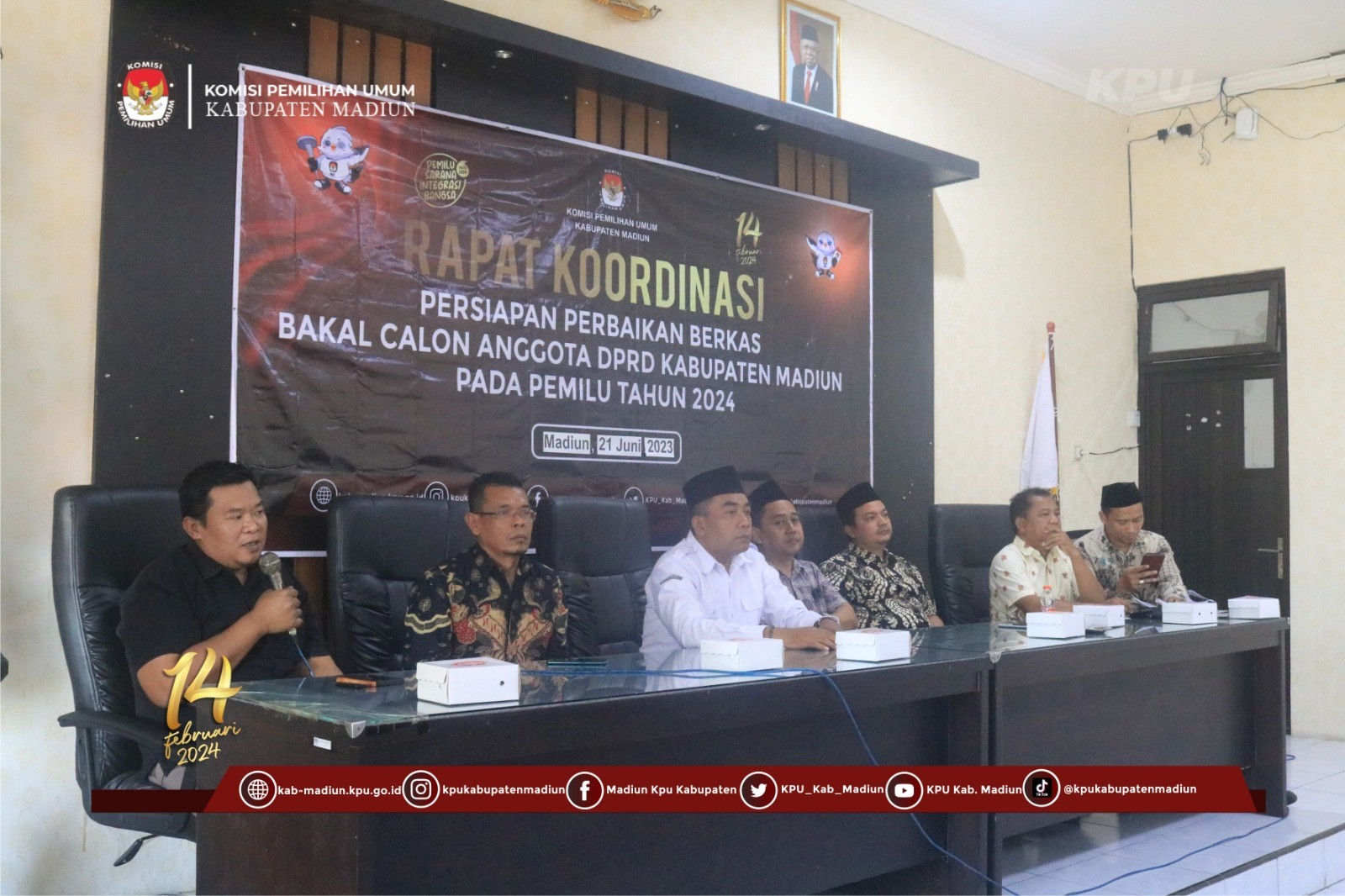 Madiun, http://kab-madiun.kpu.go.id Rabu siang pukul 13.00 wib KPU Kabupaten Madiun adakan kegiatan Rapat Koordinasi yang turut mengundang LO Partai , PPK bagian Teknis dan Bawaslu. Terkait Hal undangan Rakor ini yakni tentang Persiapan Perbaikan Berkas Bakal Calon Anggota DPRD Pada Pemilu 2024. Dalam pembukaan kegiatan Rakor ini dibuka oleh Ketua KPU Kabupaten Madiun Ali Nur Wahyudi dan dihadiri oleh Seluruh Komisioner.