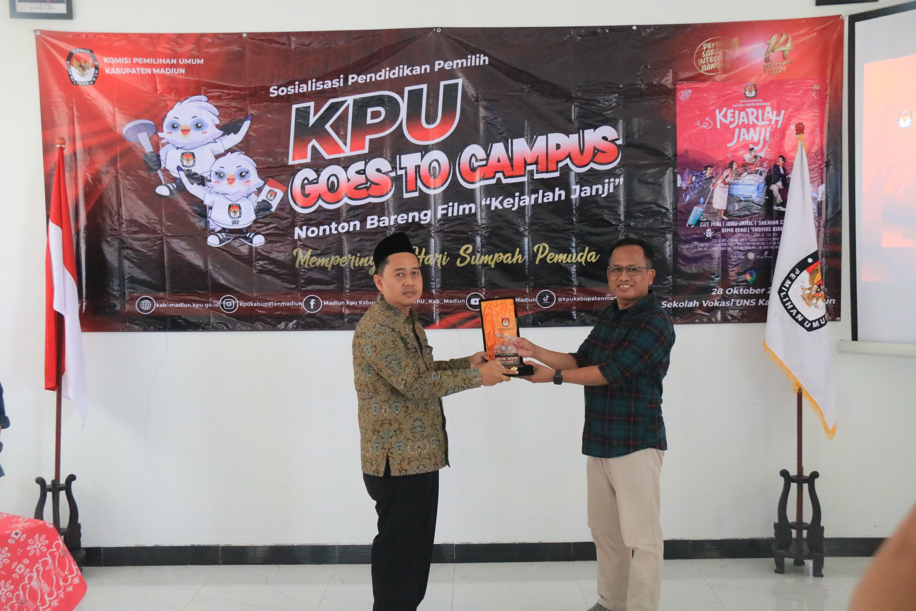 Awal Pelaksanaan Kegiatan ini yakni dengan bersama-sama mendengarkan Lagu Indonesia Raya, juga diputarkan Jingle Pemilu. Diawal sambutan juga disampaikan oleh Komisioner Divisi Sodiklih Parmas dan SDM Fahim Amrillah juga dilanjutkan oleh sambutan dari Wakil Dekan 1 Agus Dwi Priyanto. Berikut diserahkan Kenang Kenangan dari KPU Kabupaten Madiun kepada UNS yang di serahkan oleh Komisioner. Seluruh rangkaian kegiatan ini juga diselingi dengan hiburan live music akustik yang ditampilkan oleh perwakilan mahasiswa kampus UNS Kabupaten Madiun. setelah itu dilaksanakan foto bersama dan Menonton Film Kejarlah Janji sampai dengan selesai acara.