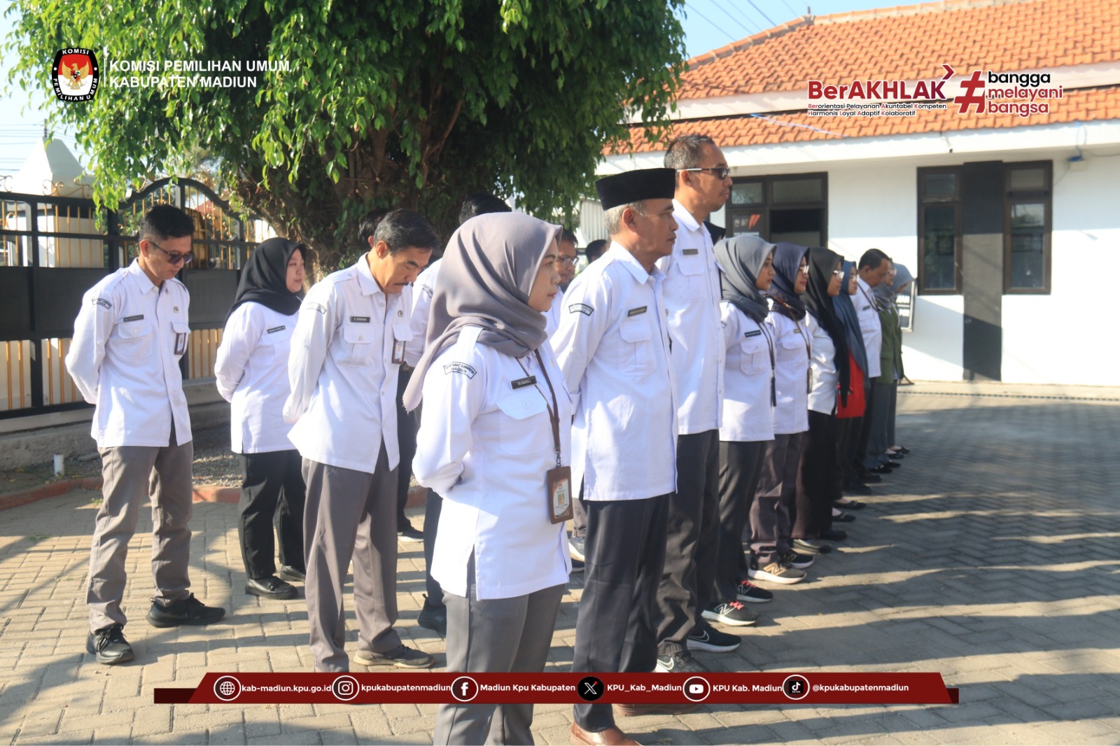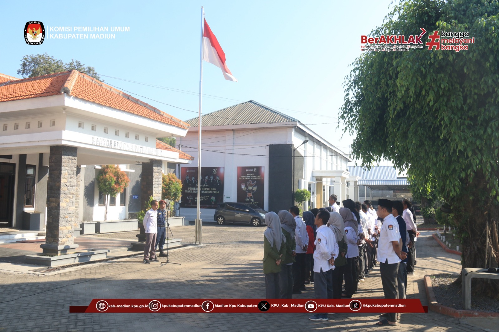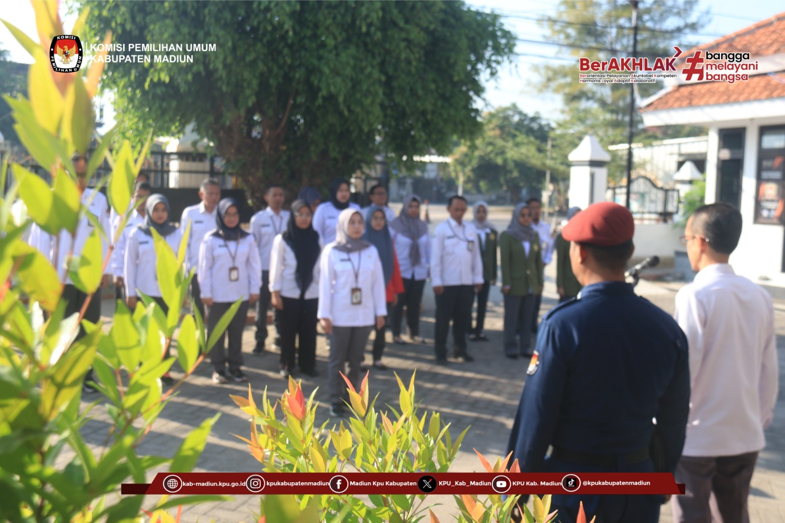 Madiun – Komisi Pemilihan Umum Kabupaten Madiun melaksankan kegiatan apel pagi di halaman kantor KPU yang berada di jalan raya Madiun – Ponorogo No. 46, Purworejo, Geger, Madiun. Kegiatan tersebut merupakan acara rutin yang digelar oleh KPU kabupaten Madiun setiap hari Senin. Apel dimulai dari jam 08.00 sampai sekitar jam 09.00 pagi tersebut berjalan dengan tertib dan khidmat.