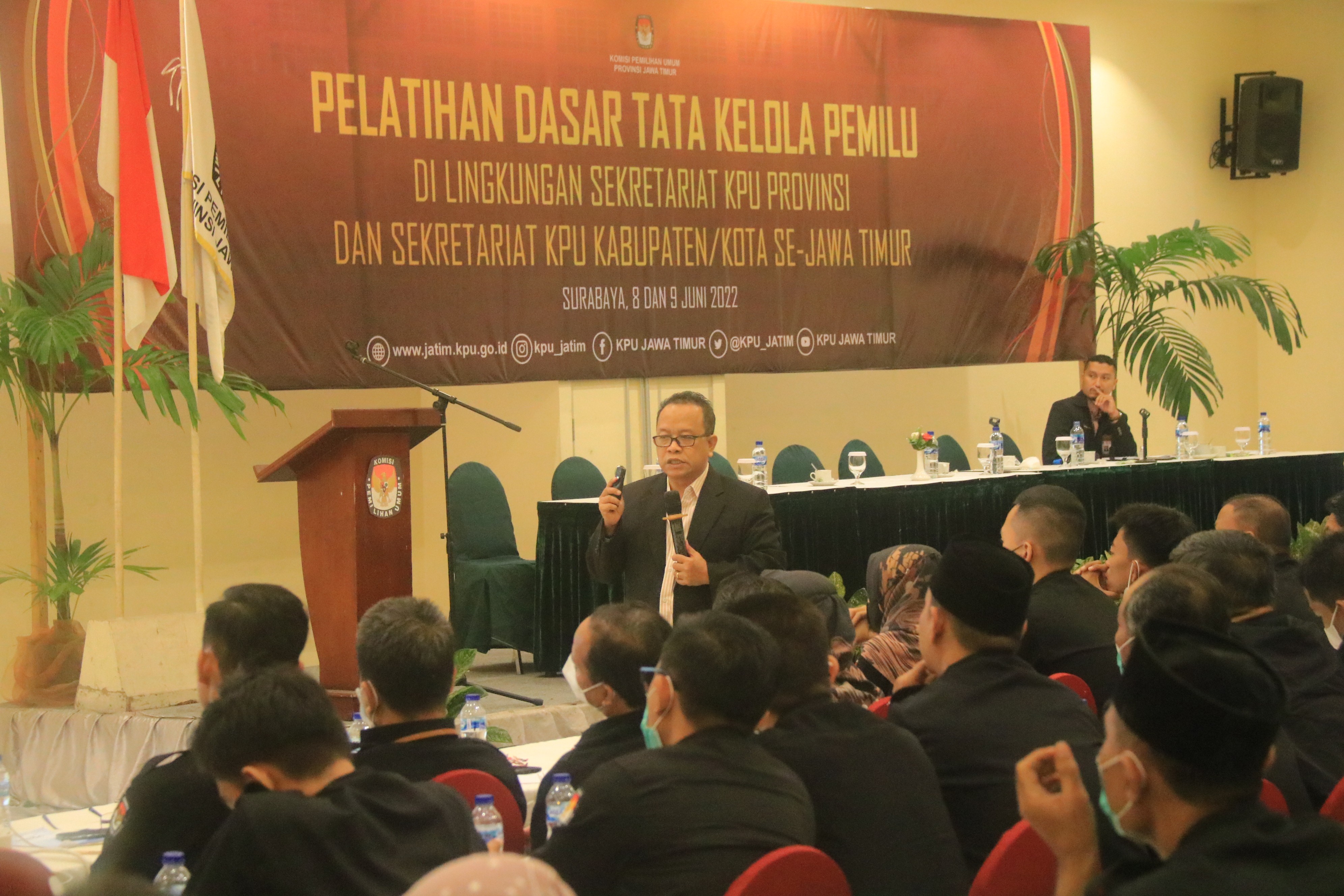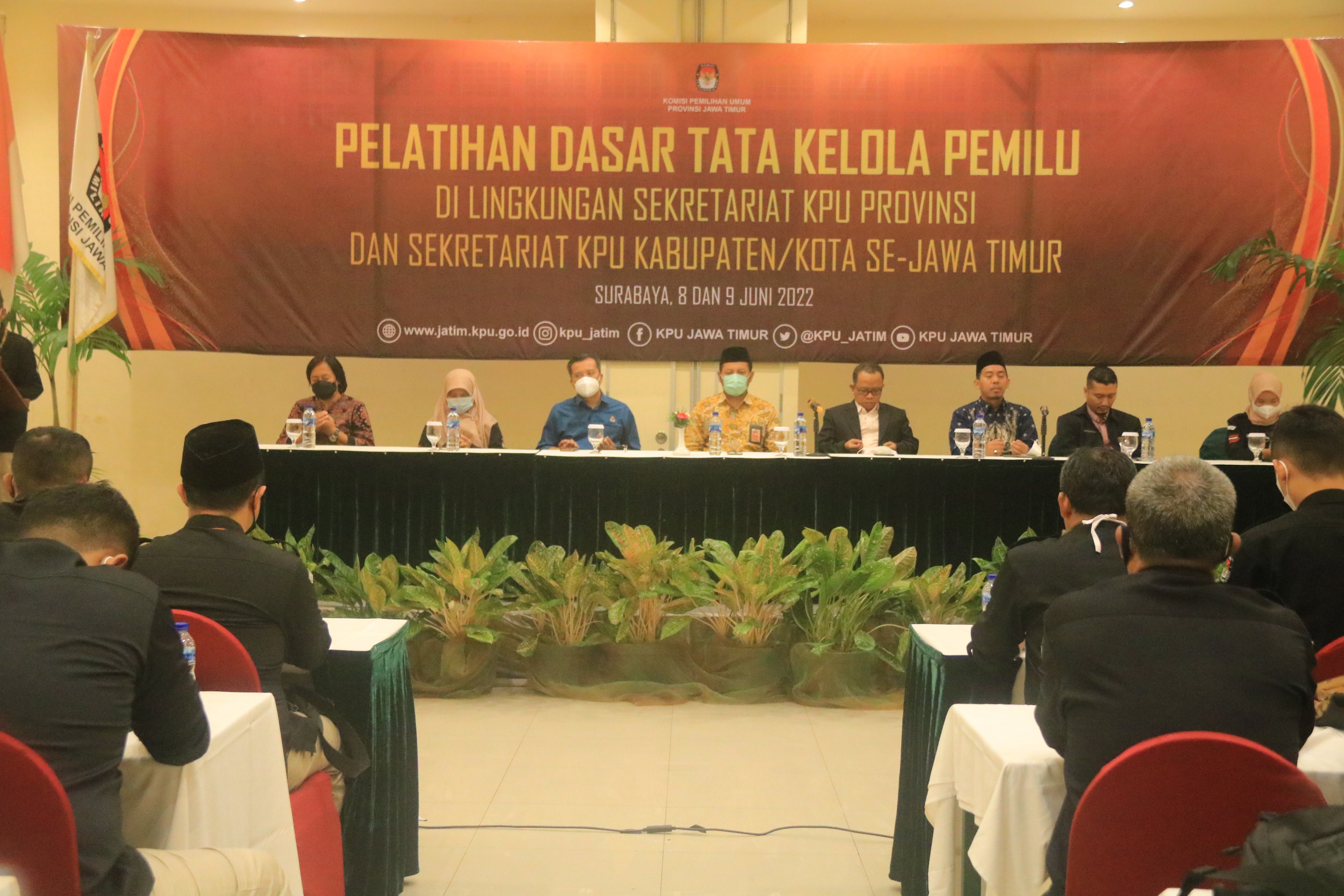 Kegiatan Pelatihan ini dilaksanakan mulai pukul 07.00 WIB yang dihadiri juga oleh Ketua KPU Provinsi Jatim Choirul Anam berserta seluruh Anggota Komisioner, beliau menyampaikan dalam sambutannya bahwasannya kegiatan pelatihan ini baru pertama kali dilaksanakan yakni oleh KPU Provinsi Jawa Timur merupakan pencapaian sebuah prestasi besar. Kegiatan ini dilaksanakan secara Luring dan Daring bersama dengan KPU RI yang dalam sambutannya diwakili oleh Sekjen KPU RI Bernad Dermawan Sutrisno yang menyampaikan bahwasannya sangat penting sekali pelaksanaan Pelatihan Dasar Tata Kelola Pemilu ini guna untuk meningkatkan Integritas , Kompentensi Individu serta Berwibawa untuk berkontribusi positif sebagai penyelenggara pemilu.