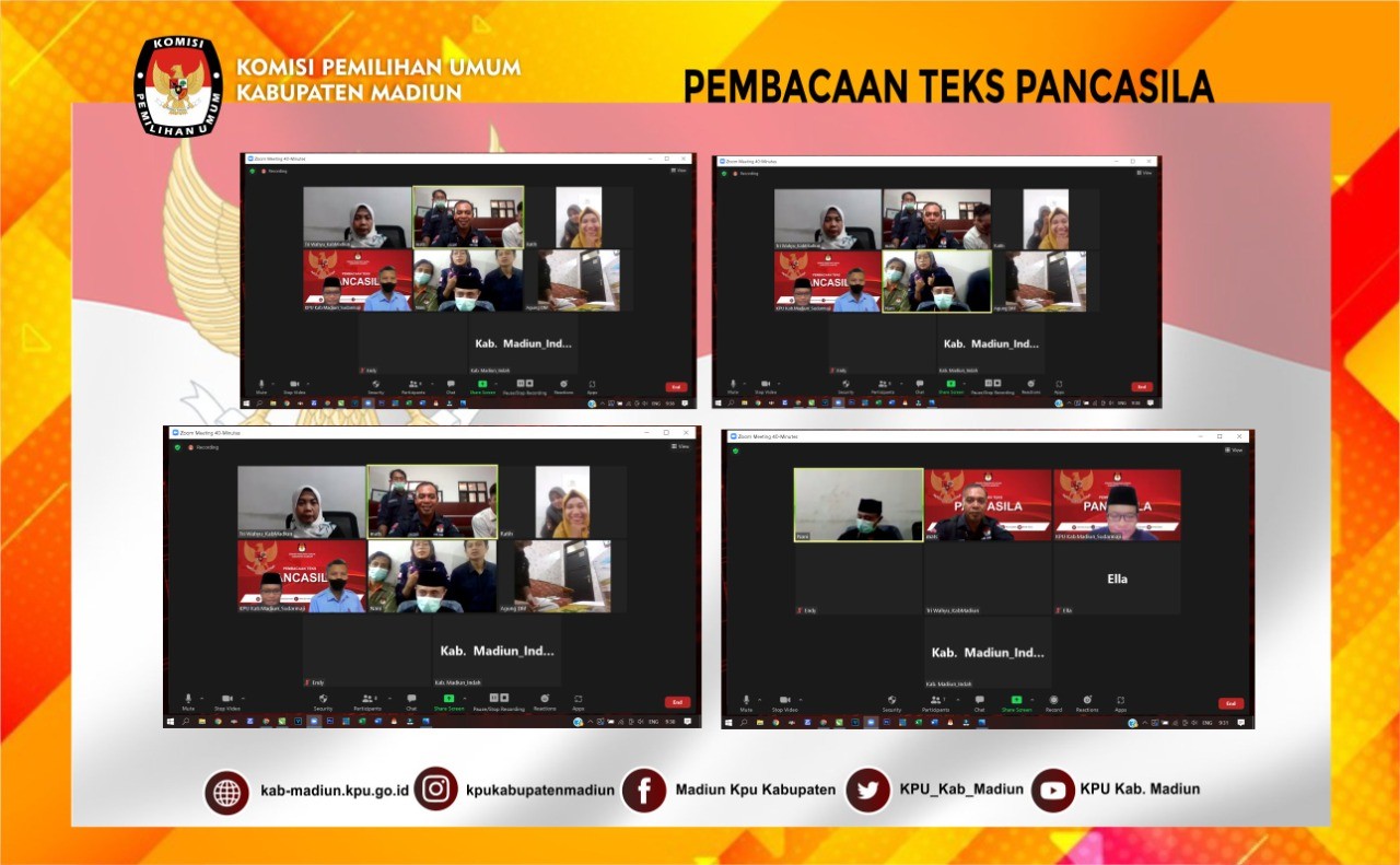 Madiun, http://kab-madiun.kpu.go.id Pagi ini pukul 09.30 WIB KPU Kabupaten Madiun laksanakan kegiatan apel pagi secara daring, yang dipimpin oleh Kepala Subbagian Teknis Dan Hubungan Masyarakat Pujo Lambang Pamungkas. Kegiatan apel pagi kali ini dalam rangka pembacaan teks Pancasila yang dipesertai seluruh Personel KPU Kabupaten Madiun. Pujo menyampaikan untuk tetap menjaga kekompakan dan kedisplinan dalam menjalankan tugas dan kewajiban serta tak lupa beliau mengingatkan untuk tetap waspada terhadap virus corona yang sampai saat ini belum berakhir tetap patuhi protokol kesehatan yang berlaku baik dilingkungan kantor maupun lingkungan rumah.