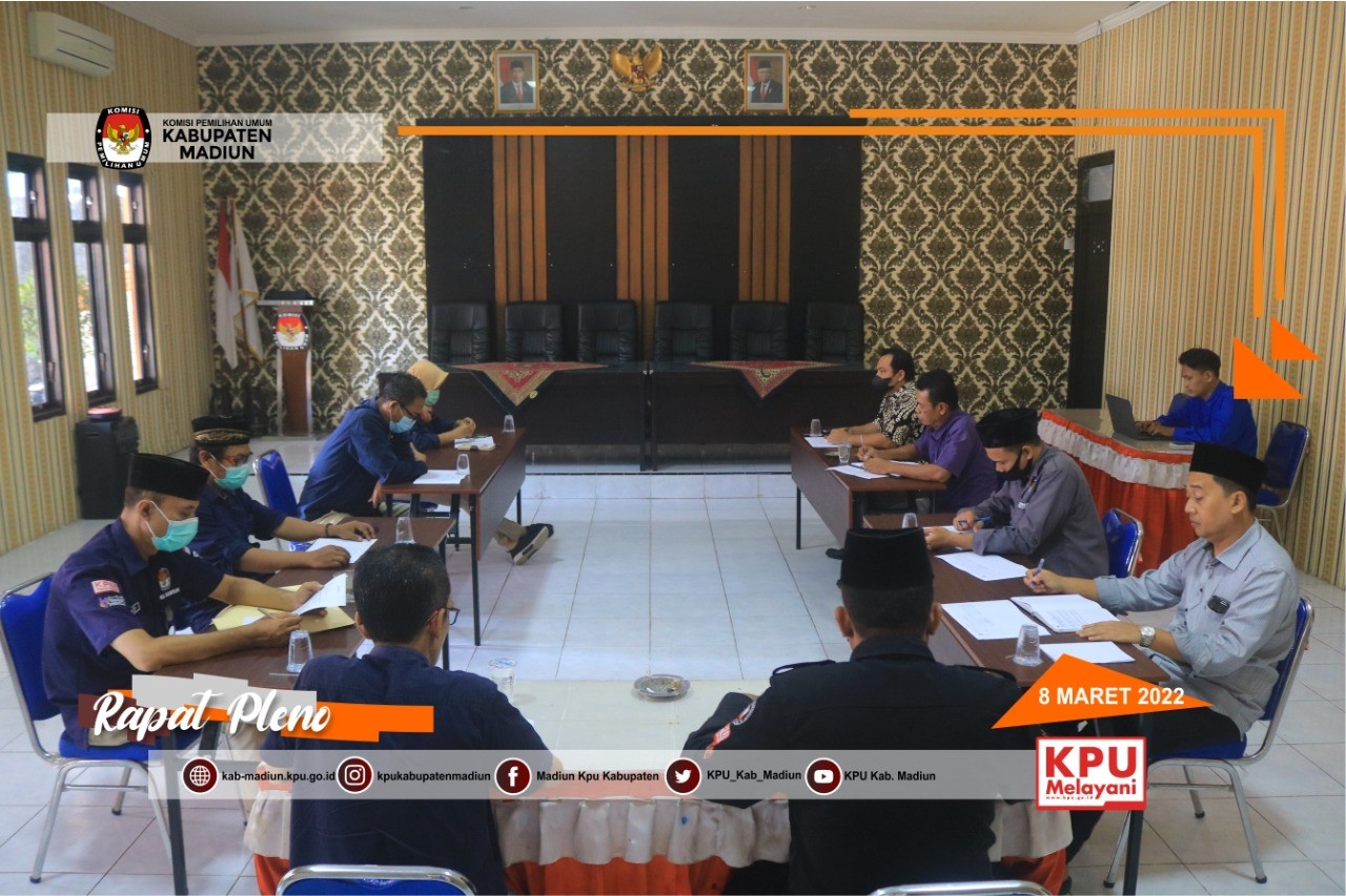 Madiun, http://kab-madiun.kpu.go.id Komisi Pemilihan Umum Kabupaten Madiun laksanakan Rapat Pleno yang membahas tentang Inmendagri No. 15 tahun 2022 yang kali ini dipimpin oleh Ketua KPU Kabupaten Madiun Ali Nur Wahyudi. Rapat Pleno yang dimulai pukul 09.00 WIB dihadiri oleh Seluruh Komisioner Lainnya , Sekretaris Serta Seluruh Kasubbag. Ali menyampaikan dalam pembukaan Rapat Pleno yakni merujuk pada Inmendagri no 15 tahun 2022 wilayah Kabupaten Madiun masuk dalam level 2 yang mana dalam kegiatan perkantoran dilaksanakan dengan sistem kerja WFH 25% dan WFO 75% mulai tanggal 8 Maret sampai dengan 14 maret 2022. seluruh peserta rapat pleno menyetujui dan menyepakati hasil yang kemudian dilanjutkan kegiatan masing masing.