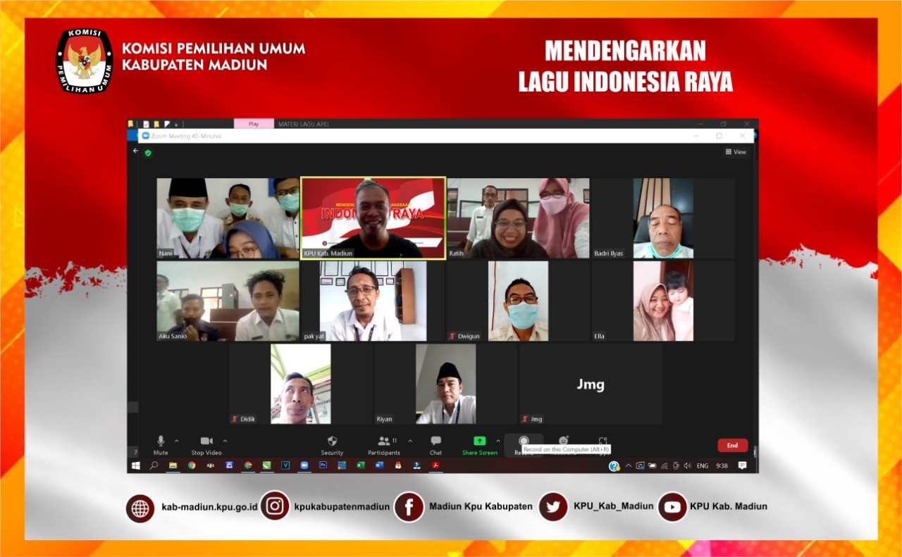 Madiun, http://kab-madiun.kpu.go.id Pagi ini, Seluruh Komisioner dan Staf Sekretariat KPU Kabupaten Madiun Laksanakan Rutinitas sebelum mengawali kegiatan. Rutinitas tersebut yakni Bersama -sama Mendengarkan Lagu Indonesia Raya yang kali ini dipimpin oleh Sub Koordinator Bagian Hukum Pujo Lambang Pamungkas. Beliau menyampaikan kepada seluruh personel KPU Kabupaten Madiun untuk tetap semangat dan bertanggung jawab terhadap tugas yang diberikan, serta memperkuat kompakan antar personel. Dikarenakan ada staf personel KPU Kabupaten Madiun yang sedang menjalankan WFH dan WFO, Kegiatan rutin ini dilaksanakan via Zoom Meeting yang dimulai pukul 09.30 WIB.