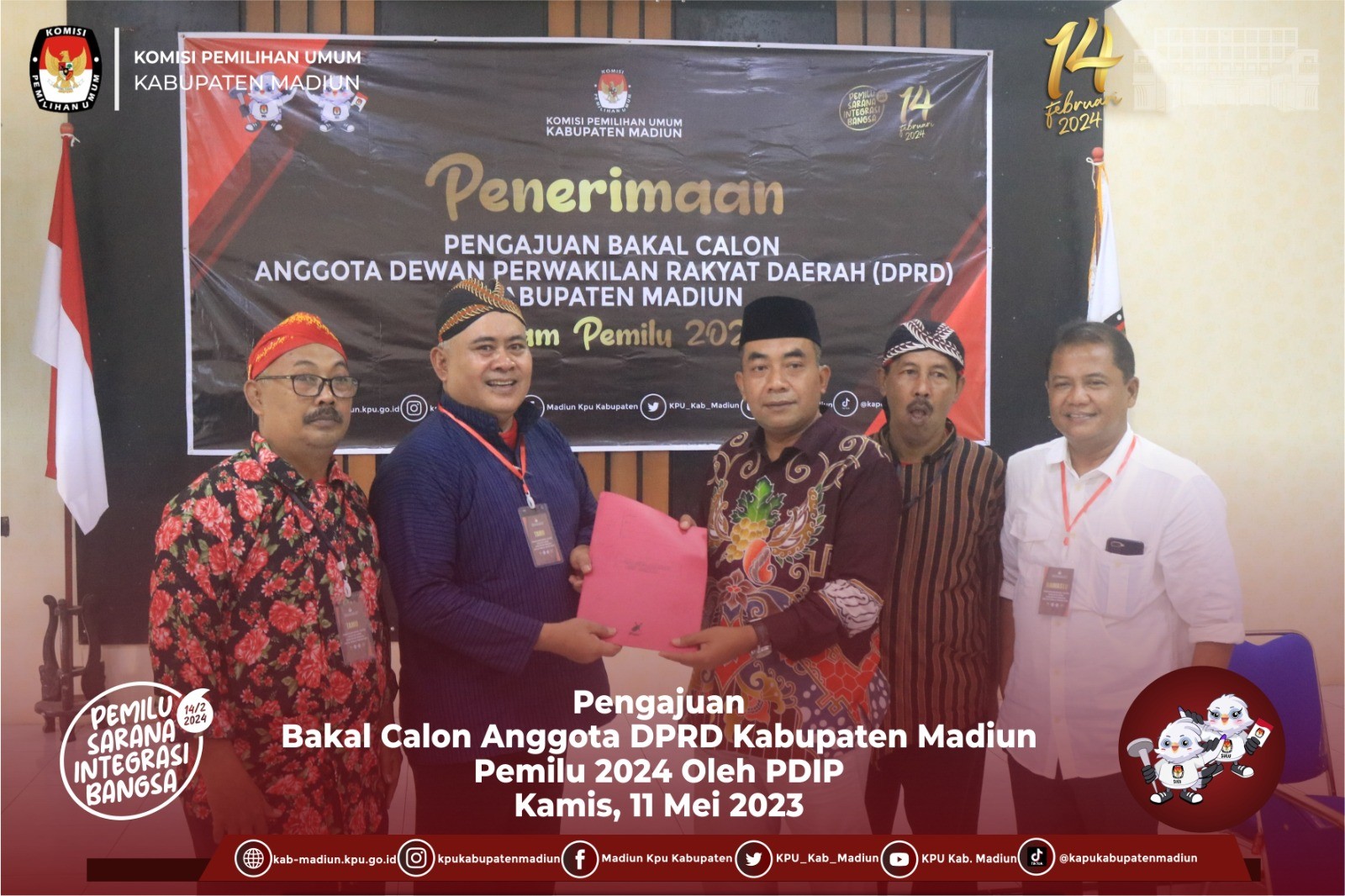 Ketua DPC PDI Perjuangan Kabupaten Madiun H. Fery Sudarsono yang terdaftar pada Dapil 1 yang membawa peserta caleg 45 orang pada keseluruhan Dapil. Setelah melaksanakan pengecekan berkas untuk pendaftaran, sudah dinyatakan Lengkap dan diterima oleh KPU Kabupaten Madiun. Seluruh rangkaian kegiatan pendaftaran ini dilaksanakan dengan lancar tanpa kendala apapun.