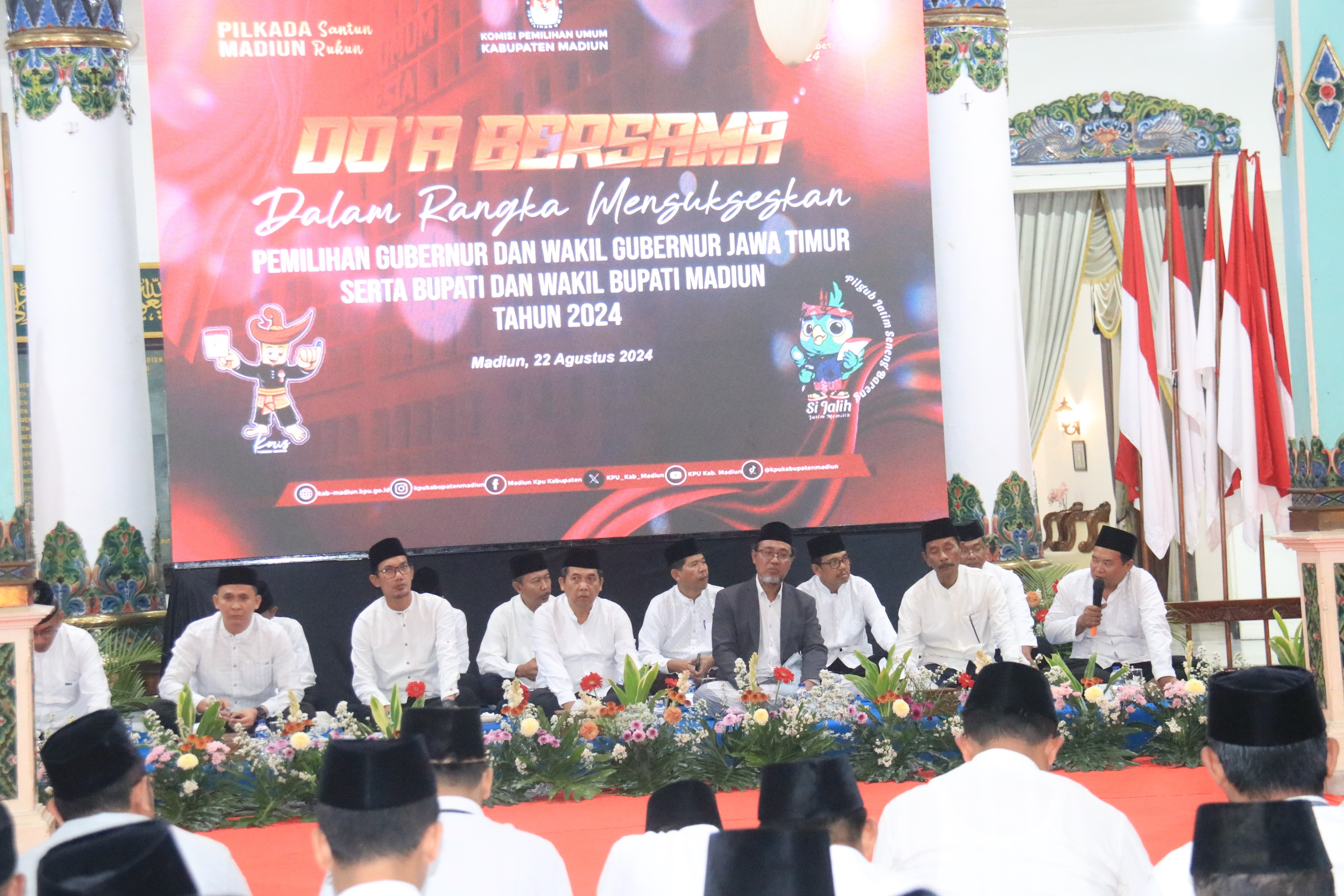 Madiun, http://kab-madiun.kpu.go.id KPU Kabupaten Madiun laksanakan kegiatan “Doa Bersama” jelang pelaksanaan PILKADA Serentak 2024, di sela sela deretan kegiatan yang sedang berjalan. Dalam pelaksanaan Doa Bersama tersebut merupakan salah satu kegiatan yang dilaksanakan oleh KPU Kabupaten Madiun yang bisa menjadi sebuah kegiatan percontohan yang sangat penting dilaksanakan, dengan harapan suksesnya seluruh proses Tahapan PILKADA serentak 2024 bisa berjalan dengan lancar. Kegiatan doa Bersama ini bertempat di Graha Muda Pendopo Kabupaten Madiun mulai pukul 19.00 WIB.