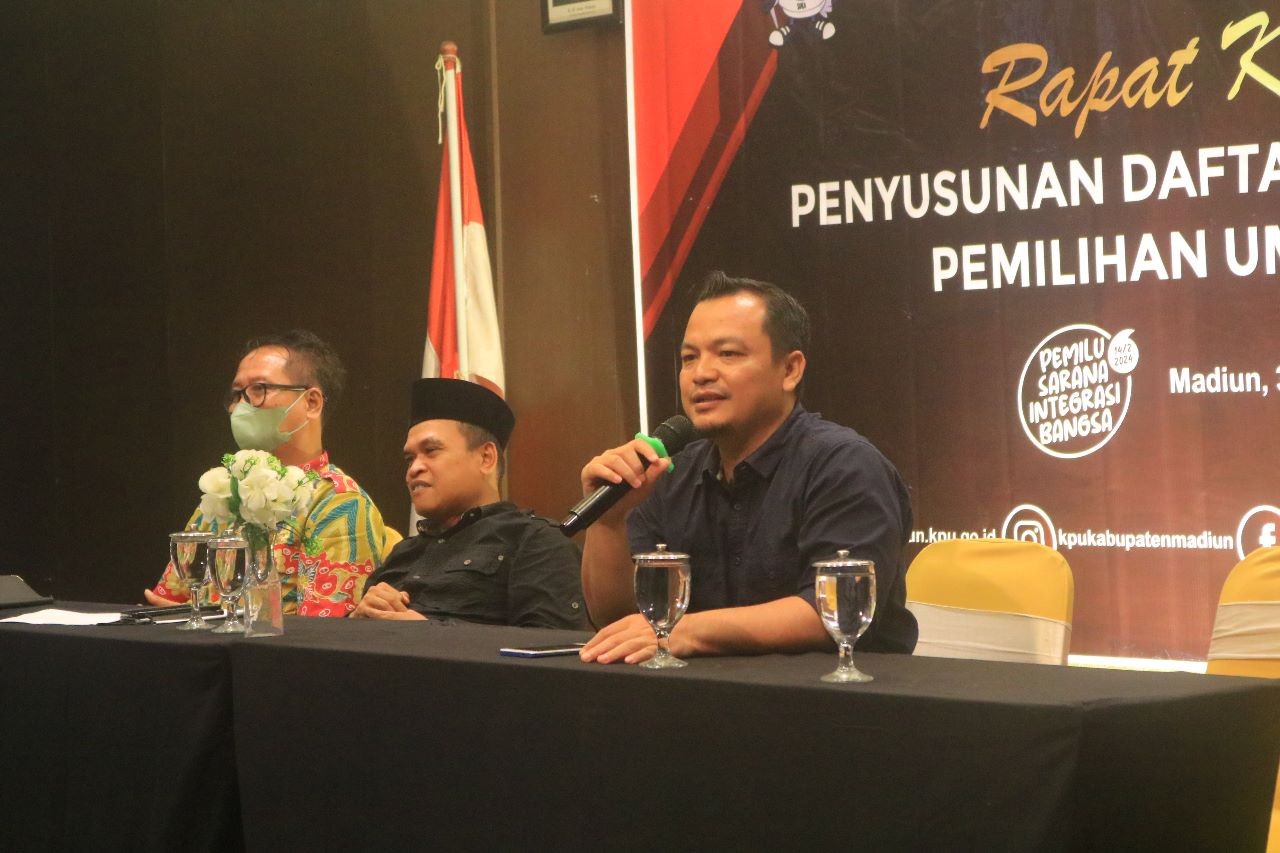 Madiun, http://kab-madiun.kpu.go.id KPU Kabupaten Madiun laksanakan kegiatan Rapat Koordinasi dengan mengundang ketua PPK dan Bagian Teknis se-Kabupaten Madiun. kegiatan yang dibuka oleh Ketua KPU Kabupaten Madiun Ali Nur Wahyudi ini dalam Rangka Rapat Koordinasi Penyusunan Daftar Pemilih Sementara untuk Pemilu Tahun 2024. turut hadir juga seluruh Komisioner , Sekretaris serta Kasubbag dan seluruh staf yang bertugas. dalam kegiatan ini juga turut mengundang dari Komisioner Bawaslu Kabupaten Madiun Wahyudi dan dari perwakilan Dispenduk Capil.