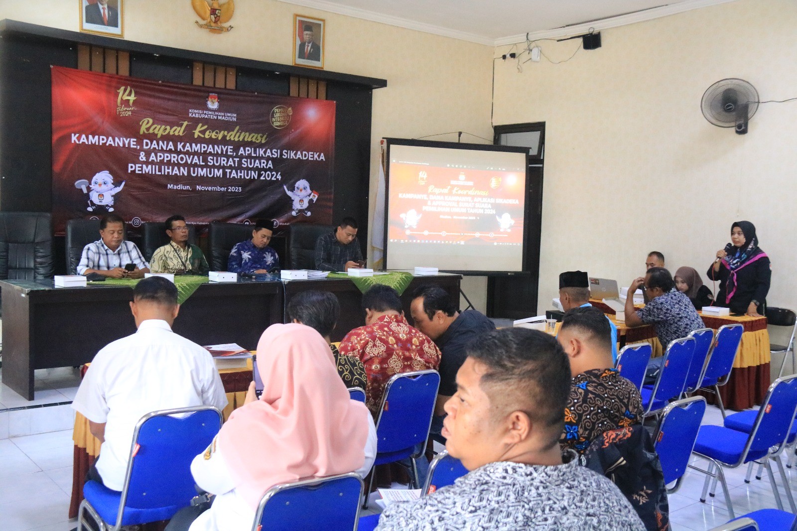 Madiun, http://kab-madiun.kpu.go.id Hari ini KPU Kabupaten Madiun laksanakan kegiatan Rapat Koordinasi yang turut mengundang perwakilan forkompimda, Polres, Bawaslu, Kodim berserta Partai Politik. dilaksanakan kegiatan ini dalam rangka Rapat Koordinasi Kampanye, Dana Kampanye, Aplikasi SIKADEKA serta Approval Surat Suara Pemilihan Umum tahun 2024.