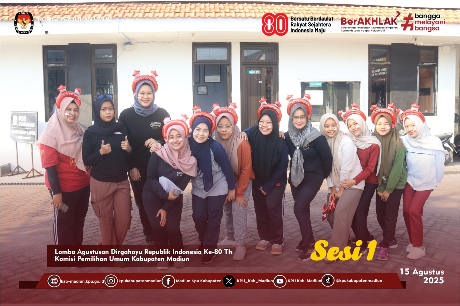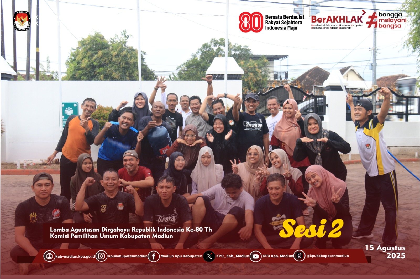 Madiun – Dalam rangka memperingati Hari Ulang Tahun (HUT) ke-80 Kemerdekaan Republik Indonesia, Komisi Pemilihan Umum (KPU) Kabupaten Madiun menggelar berbagai lomba yang berlangsung di halaman kantor KPU Kabupaten Madiun pada Jumat (15/8/2025). Acara ini dibagi dalam dua sesi, yaitu pagi dan siang setelah salat Jumat, serta diikuti oleh seluruh jajaran pimpinan dan staf serta mahasiswa magang di KPU Kabupaten Madiun.