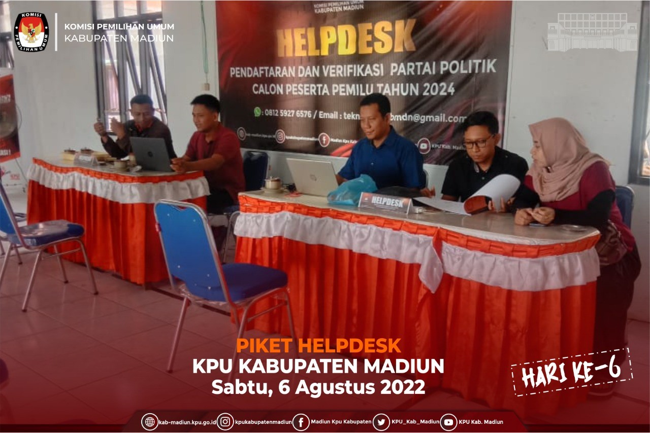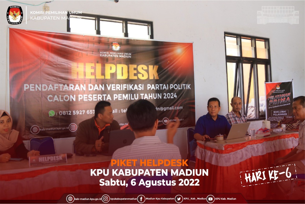 Jumangin menyampaikan terkait Pelaksanaan Vermin dan Verfak dari KPU Kabupaten Madiun sudah siap. “Karena kita sudah bentuk Tim Operator SIPOL untuk Pelaksanaan Vermin dan Verfak di masa tahapan awal ini, jadi terkait Kesiapan memang sudah sangat siap”, imbuhnya. Dalam kesempatan Monitoring dari Bawaslu ke Helpdesk KPU Kabupaten Madiun mengharapkan tidak ada kendala dalam pelaksanaan Verifikasi Administrasi dan Verifikasi Faktual Partai Politik.
