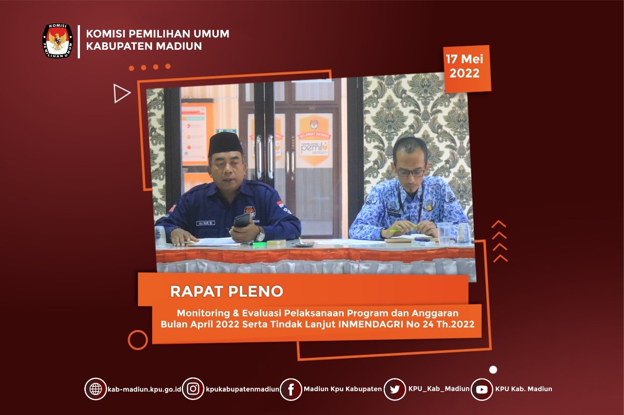 Madiun, http://kab-madiun.kpu.go.id Komisi Pemilihan Umum Kabupaten Madiun laksanakan Rapat Pleno yang dipimpin oleh Ketua KPU Kabupaten Madiun Ali Nur Wahyudi, Rapat Pleno yang bertempat diaula kantor ini dihadiri oleh Seluruh Anggota Komisioner, Sekretaris serta Seluruh Kasubbag dan Staf Fungsional bagian keuangan. Dibahas dalam Rapat Pleno yakni tentang Monitoring dan Evaluasi Pelaksanaan Program dan Anggaran bulan april 2022 yang dilaporkan oleh Sekretaris KPU Kabupaten Madiun Agung Dwi Murdianto dan Kasubbag Program & Data Ardy Sugiarto, beliau menyampaikan Laporan realisasi Anggaran sampai dengan bulan April 2022 yang mencapai Prosentase sebesar 26,06 % dari Pagu Anggaran. Seluruh peserta Rapat Pleno menyetujui dan Menerima hasil Laporan Tersebut.