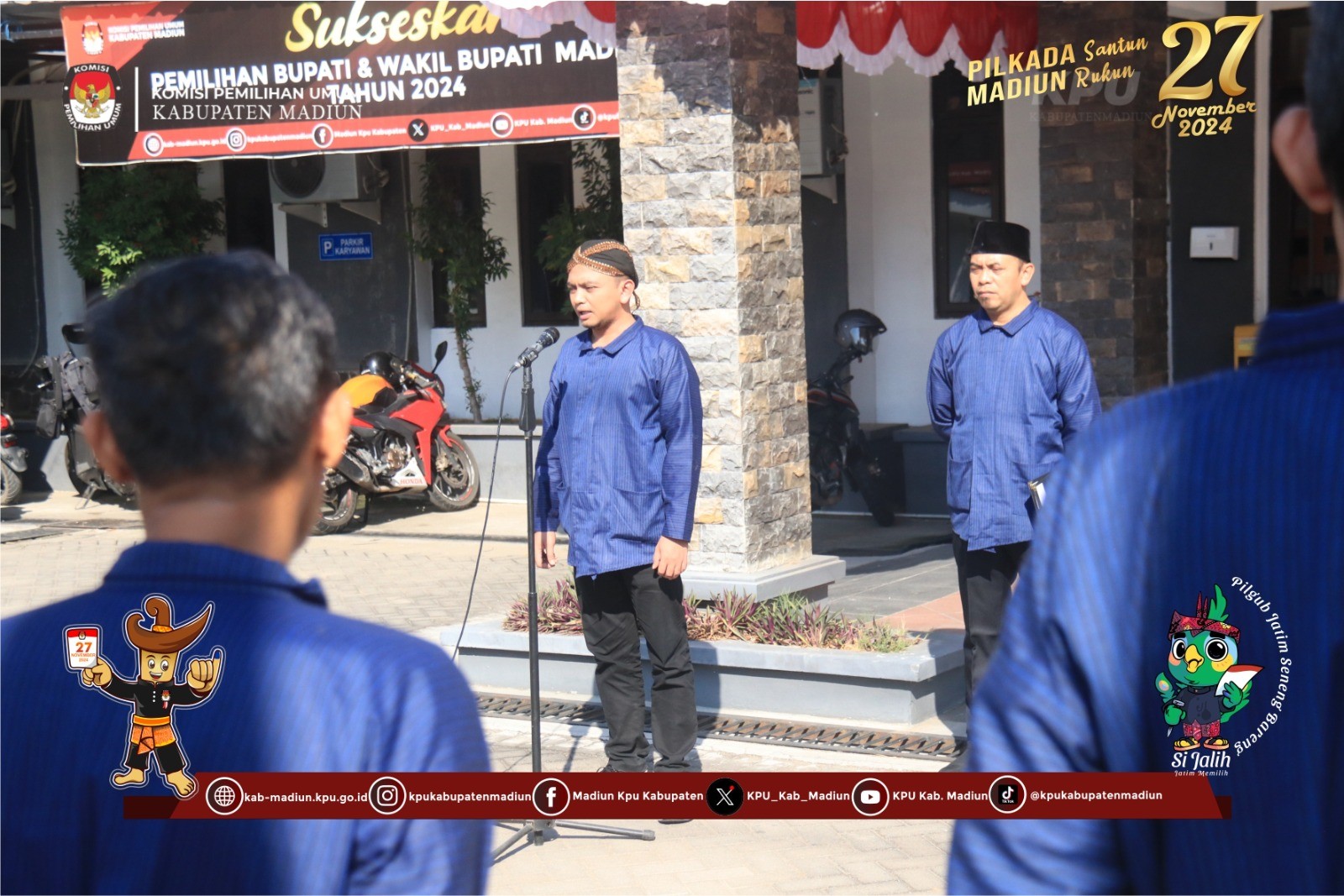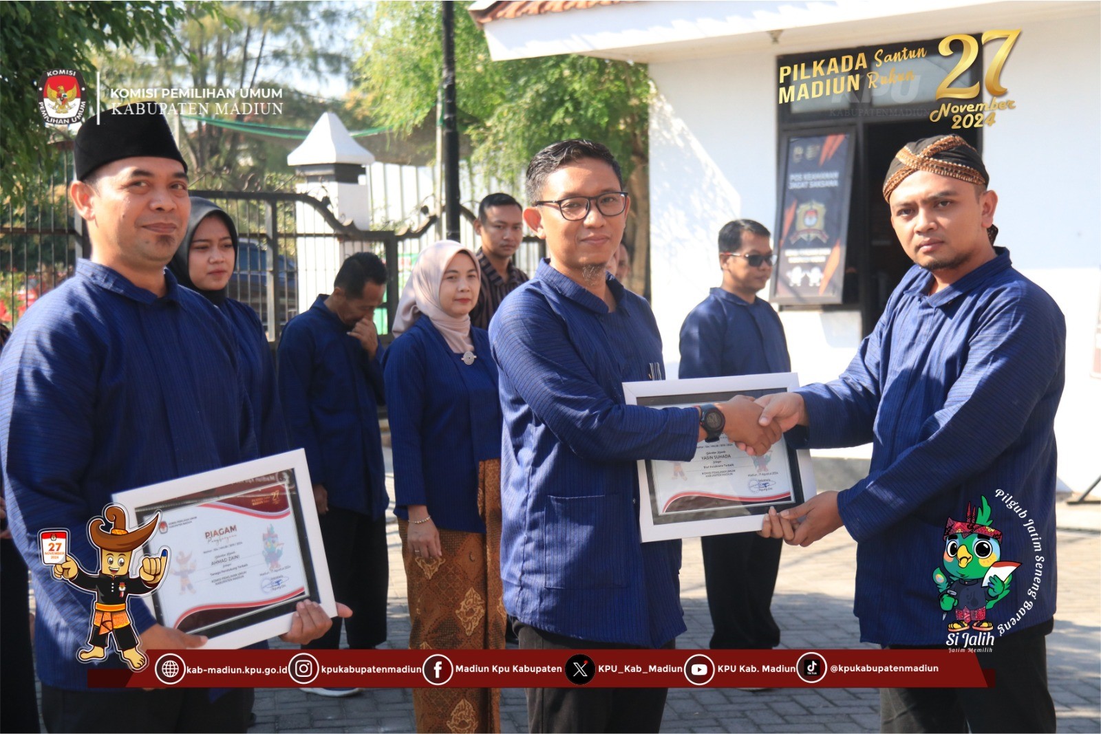Yakni dalam amanatnya Irsyad menyampaikan Bahwasannya Seluruh Pahlawan telah selesai memerdekakan dirinya sendiri dari pertarungan hawa nafsunya sebelum memerdekakan bangsanya, Yang merupakan romantisme Sejarah yang telah terukir seperti suri tauladan dari Jendral Sudirman, beliau mengharapkan kekompakan terhadap tugas dan tanggung jawab yang diberikan untuk menuju tahapan Pilkada serentak yang sesuai tagline kita “Pilkada Santun, Madiun Rukun”. Di sela sela Kegiatan Upacara bendera ini dilanjutkan dengan penyerahan piagam penghargaan kepada karyawan KPU Kabupaten Madiun yang berprestasi yang dilaksanakan dengan lancar dan di akhiri dengan foto Bersama.