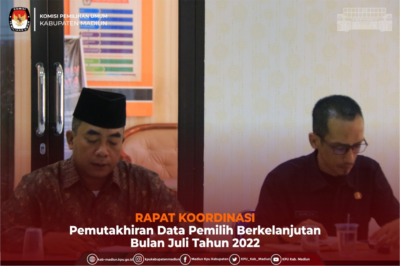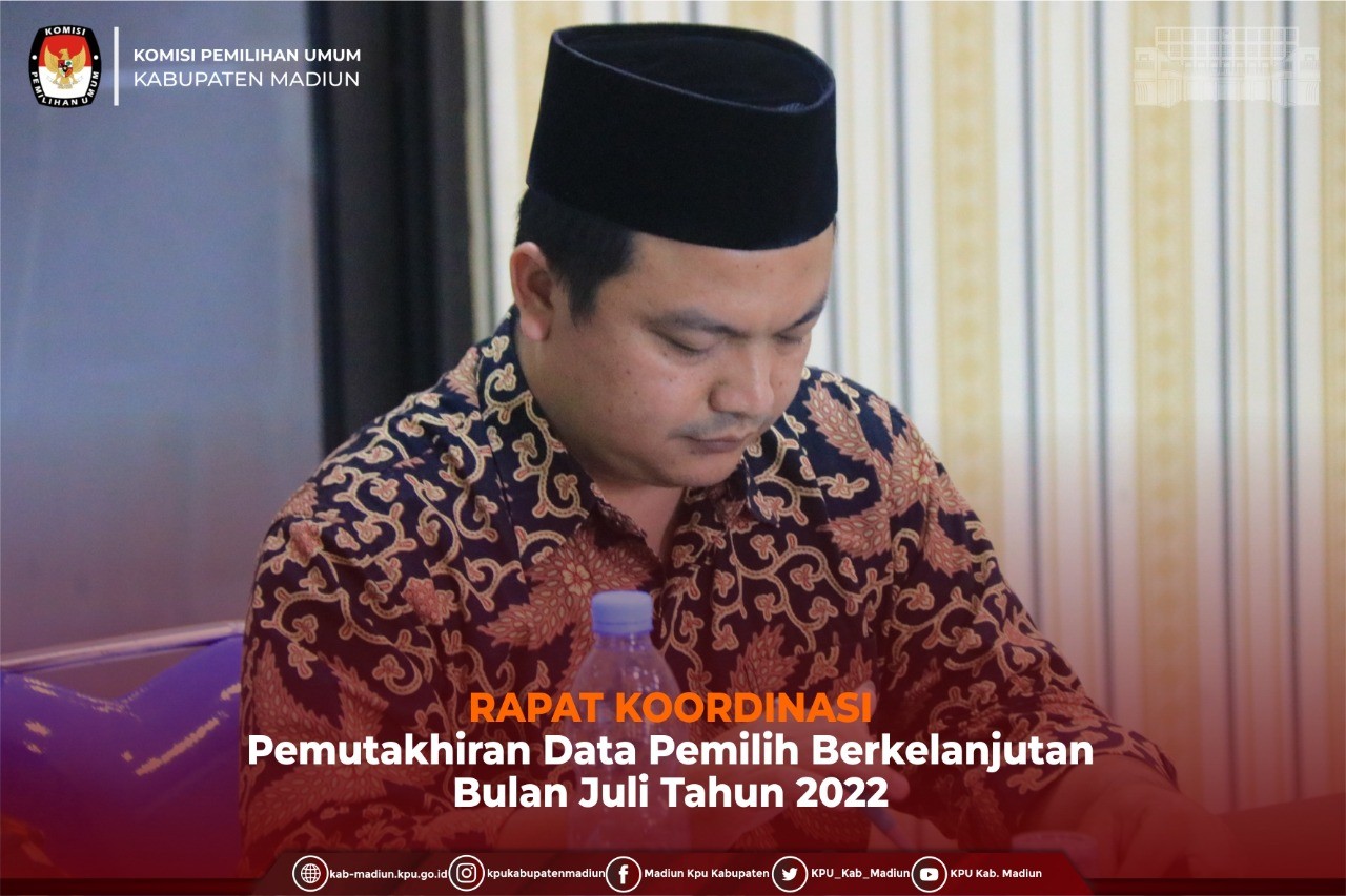 Madiun, http://kab-madiun.kpu.go.id Hari ini KPU Kabupaten Madiun laksanakan giat Rapat Koordinasi internal tentang Data Pemilih Berkelanjutan bulan Juli tahun 2022. Kegiatan yang dimulai pukul 10.00 WIB ini di pimpin oleh Ketua KPU Kabupaten Madiun Ali Nur Wahyudi dan dihadiri oleh seluruh Komisioner, Sekretaris , Kasubbag. Dalam pembukaannya Ali menyampaikan bahwasannya pada Pemuthakiran DPB ini, melihat sudah memasuki tahapan pemilu serentak 2024 jadi supaya benar-benar diteliti sebaik mungkin, baik dari Administrasi dan Dokumentasi serta Hard copy benar benar disampaikan dengan baik.