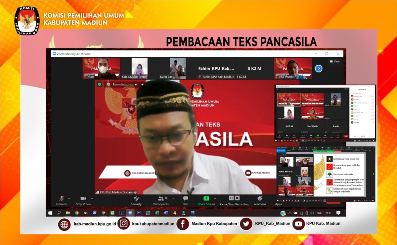 Madiun, http://kab-madiun.kpu.go.id KPU Kabupaten Madiun laksanakan Kegiatan Rutin Yakni Pembacaan Teks Pancasila secara bersama sama melalui Madia Jaringan (Daring). Kali ini dipimpin oleh Sub Koordinator Bagian Keuangan, Umum dan Logistik Sudarmaji Ariwibowo yang dihadiri oleh Seluruh peserta dari Komisioner dan Seluruh Staf Sekretariat. Kegiatan ini dilaksanakan selama proses WFH dan WFO berlangsung yang dimulai pukul 09.30 WIB.