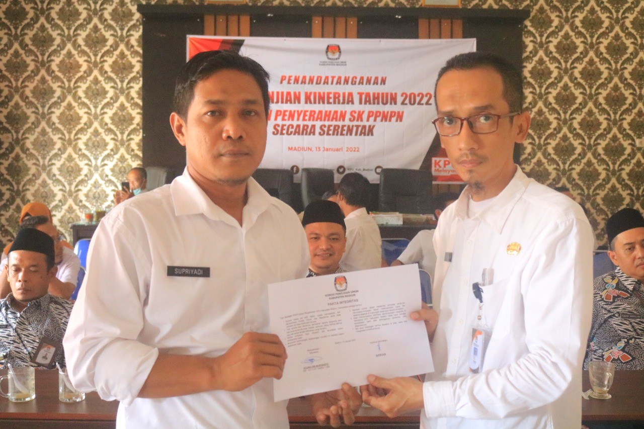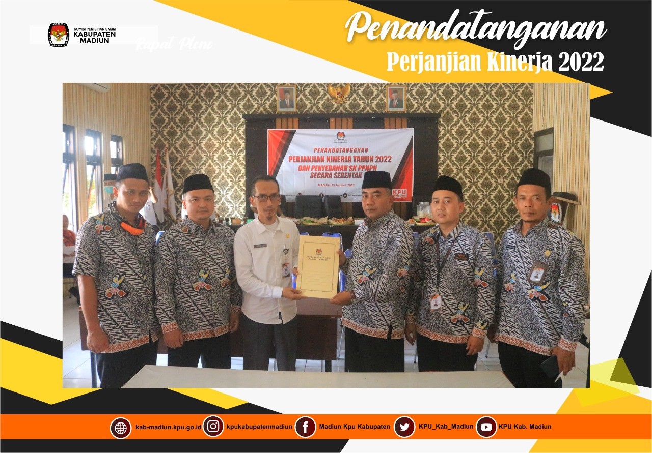 Madiun, http://kab-madiun.kpu.go.id Hari ini KPU Kabupaten Madiun mengikuti serta melaksanakan kegiatan yang diadakan Serentak bersama dengan KPU Provinsi Jawa Timur dan Seluruh 38 KPU Kab/Kota lainnya. Kegiatan yang dilaksanakan secara Daring dan dihadiri oleh Ketua KPU Provinsi Jatim Choirul Anam serta Sekretaris KPU Provinsi Jatim Nanik Karsini ini dalam rangka Penandatanganan Perjanjian Kinerja Tahun 2022 dan Penyerahan SK PPNPN Secara Serentak. Kegiatan ini dimulai pukul 10.00 WIB, dibuka dengan sambutan dari Ketua KPU Provinsi Jawa Timur. Dalam kegiatan tersebut turut hadir Ketua KPU Kabupaten Madiun Ali Nur Wahyudi juga seluruh Komisioner lainnya, Sekretaris KPU Kabupaten Madiun Agung Dwi Murdianto beserta seluruh staf sekretariat KPU Kabupaten Madiun.