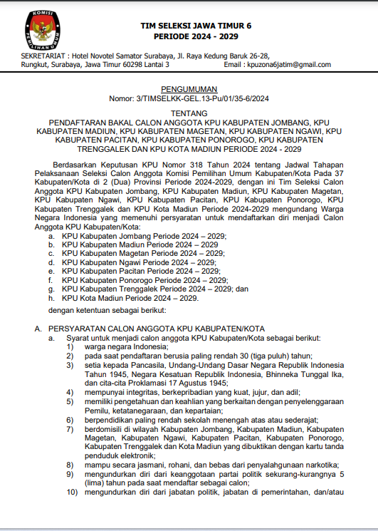 PENDAFTARAN BAKAL CALON ANGGOTA KPU KABUPATEN JOMBANG, KPU KABUPATEN MADIUN, KPU KABUPATEN MAGETAN, KPU KABUPATEN NGAWI, KPU KABUPATEN PACITAN, KPU KABUPATEN PONOROGO, KPU KABUPATEN TRENGGALEK DAN KPU KOTA MADIUN PERIODE 2024 - 2029.