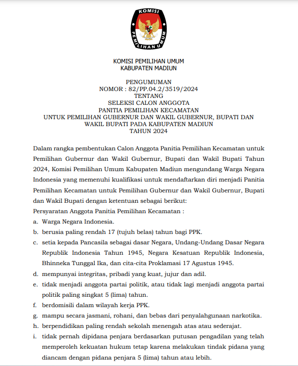 Madiun, http://kab-madiun.kpu.go.id Pengumuman Telah Dibuka Pendaftaran PPK untuk Pilkada 2024 bisa klik Download, untuk seluruh pendaftarannya dilakukan secara online melalui website https://siakba.kpu.go.id dan wajib mengumpulkan berkas harcopy ke Kantor KPU Kabupaten Madiun pada saat jam kerja 08.00 - 14.00 WIB.
